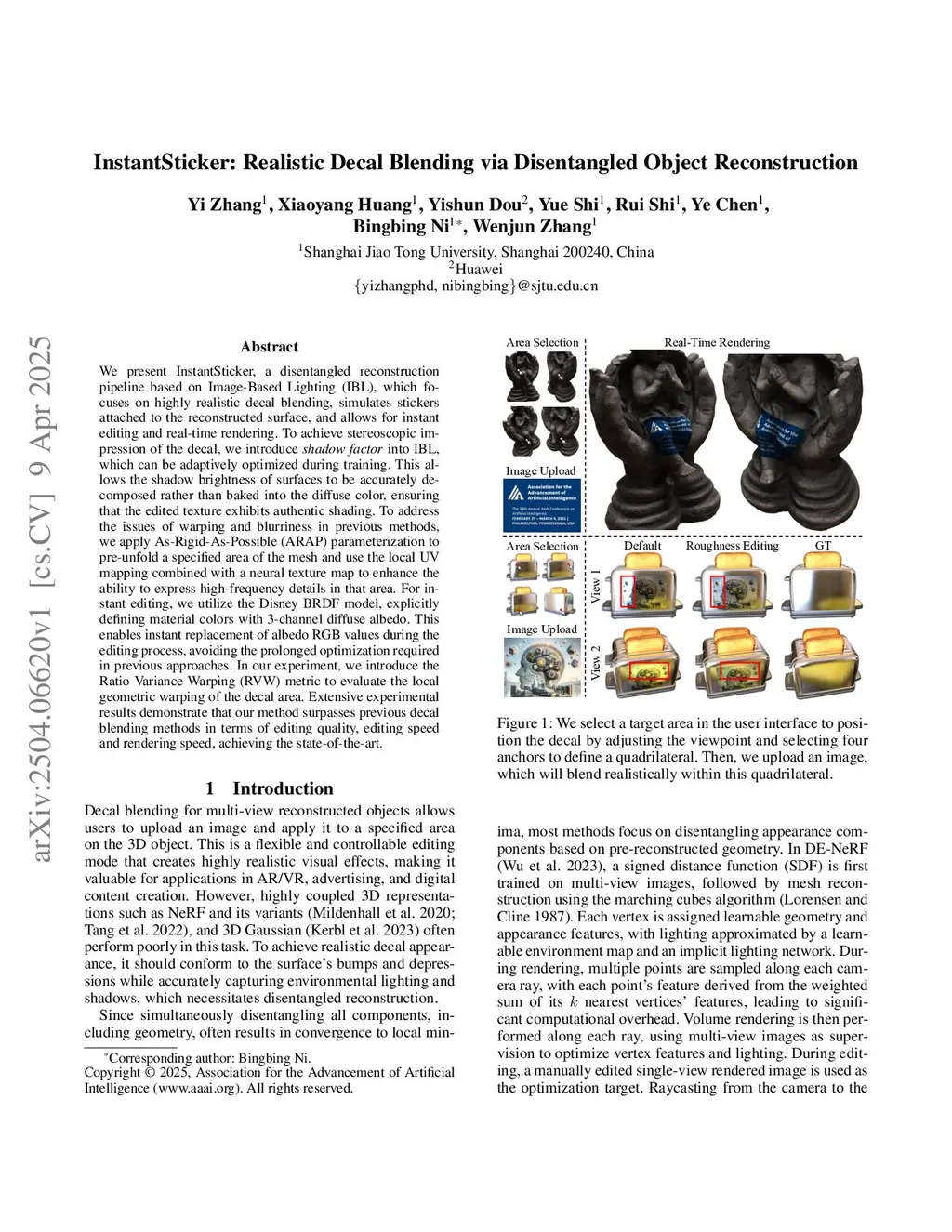 We present InstantSticker, a disentangled reconstruction pipeline based on Image-Based Lighting (IBL), which focuses on highly realistic decal blending, simulates stickers attached to the reconstructed surface, and allows for instant editing and real-time rendering. To achieve stereoscopic impression of the decal, we introduce shadow factor into IBL, which can be adaptively optimized during training. This allows the shadow brightness of surfaces to be accurately decomposed rather than baked into the diffuse color, ensuring that the edited texture exhibits authentic shading. To address the issues of warping and blurriness in previous methods, we apply As-Rigid-As-Possible (ARAP) parameterization to pre-unfold a specified area of the mesh and use the local UV mapping combined with a neural texture map to enhance the ability to express high-frequency details in that area. For instant editing, we utilize the Disney BRDF model, explicitly defining material colors with 3-channel diffuse albedo. This enables instant replacement of albedo RGB values during the editing process, avoiding the prolonged optimization required in previous approaches. In our experiment, we introduce the Ratio Variance Warping (RVW) metric to evaluate the local geometric warping of the decal area. Extensive experimental results demonstrate that our method surpasses previous decal blending methods in terms of editing quality, editing speed and rendering speed, achieving the state-of-the-art.