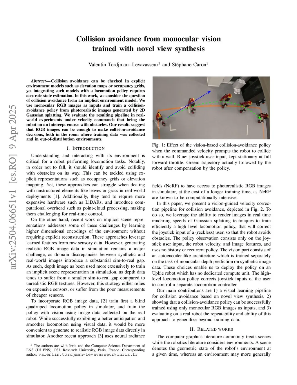 Collision avoidance can be checked in explicit environment models such as elevation maps or occupancy grids, yet integrating such models with a locomotion policy requires accurate state estimation. In this work, we consider the question of collision avoidance from an implicit environment model. We use monocular RGB images as inputs and train a collisionavoidance policy from photorealistic images generated by 2D Gaussian splatting. We evaluate the resulting pipeline in realworld experiments under velocity commands that bring the robot on an intercept course with obstacles. Our results suggest that RGB images can be enough to make collision-avoidance decisions, both in the room where training data was collected and in out-of-distribution environments.