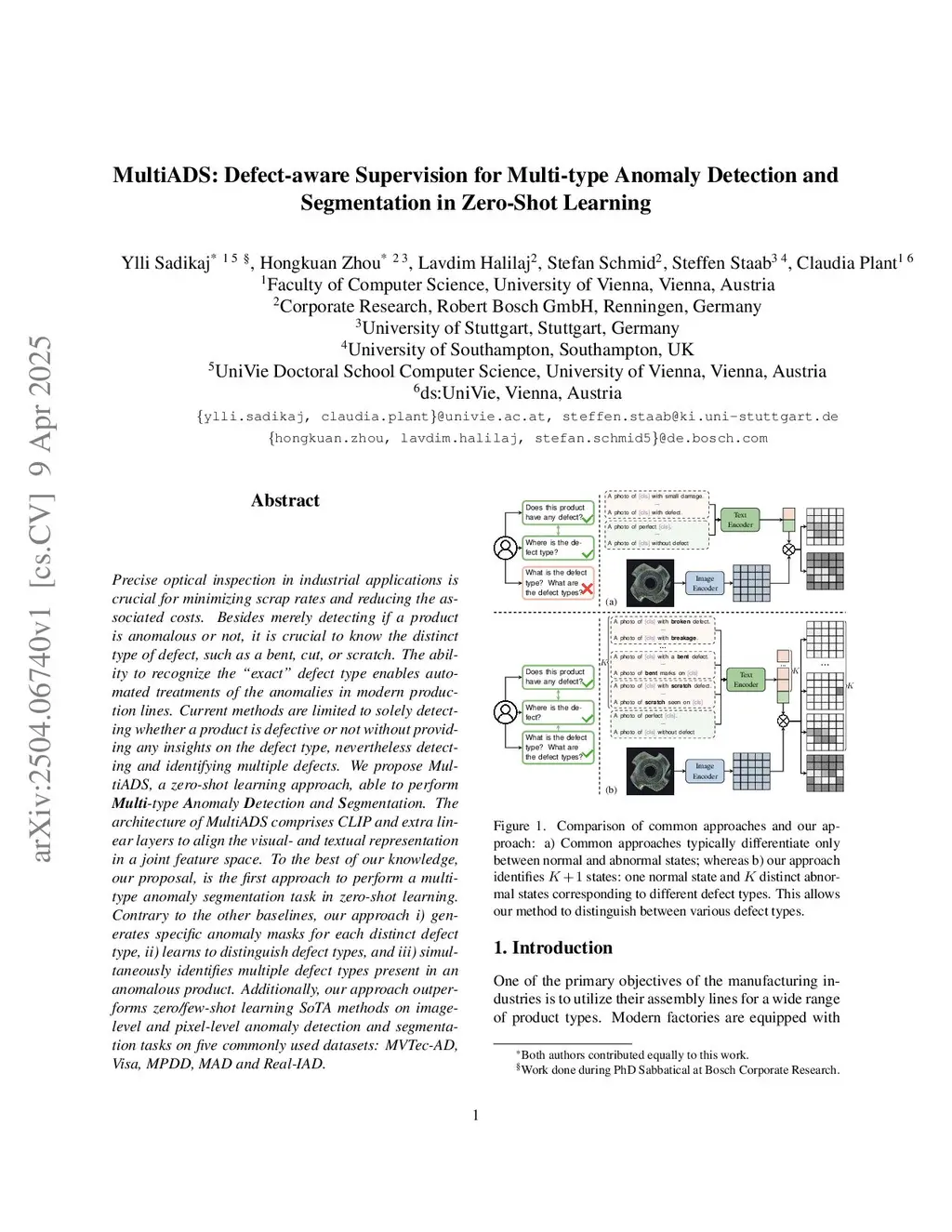 Precise optical inspection in industrial applications is crucial for minimizing scrap rates and reducing the associated costs. Besides merely detecting if a product is anomalous or not, it is crucial to know the distinct type of defect, such as a bent, cut, or scratch. The ability to recognize the "exact" defect type enables automated treatments of the anomalies in modern production lines. Current methods are limited to solely detecting whether a product is defective or not without providing any insights on the defect type, nevertheless detecting and identifying multiple defects. We propose MultiADS, a zero-shot learning approach, able to perform Multi-type Anomaly Detection and Segmentation. The architecture of MultiADS comprises CLIP and extra linear layers to align the visual- and textual representation in a joint feature space. To the best of our knowledge, our proposal, is the first approach to perform a multi-type anomaly segmentation task in zero-shot learning. Contrary to the other baselines, our approach i) generates specific anomaly masks for each distinct defect type, ii) learns to distinguish defect types, and iii) simultaneously identifies multiple defect types present in an anomalous product. Additionally, our approach outperforms zero/few-shot learning SoTA methods on image-level and pixel-level anomaly detection and segmentation tasks on five commonly used datasets: MVTec-AD, Visa, MPDD, MAD and Real-IAD.