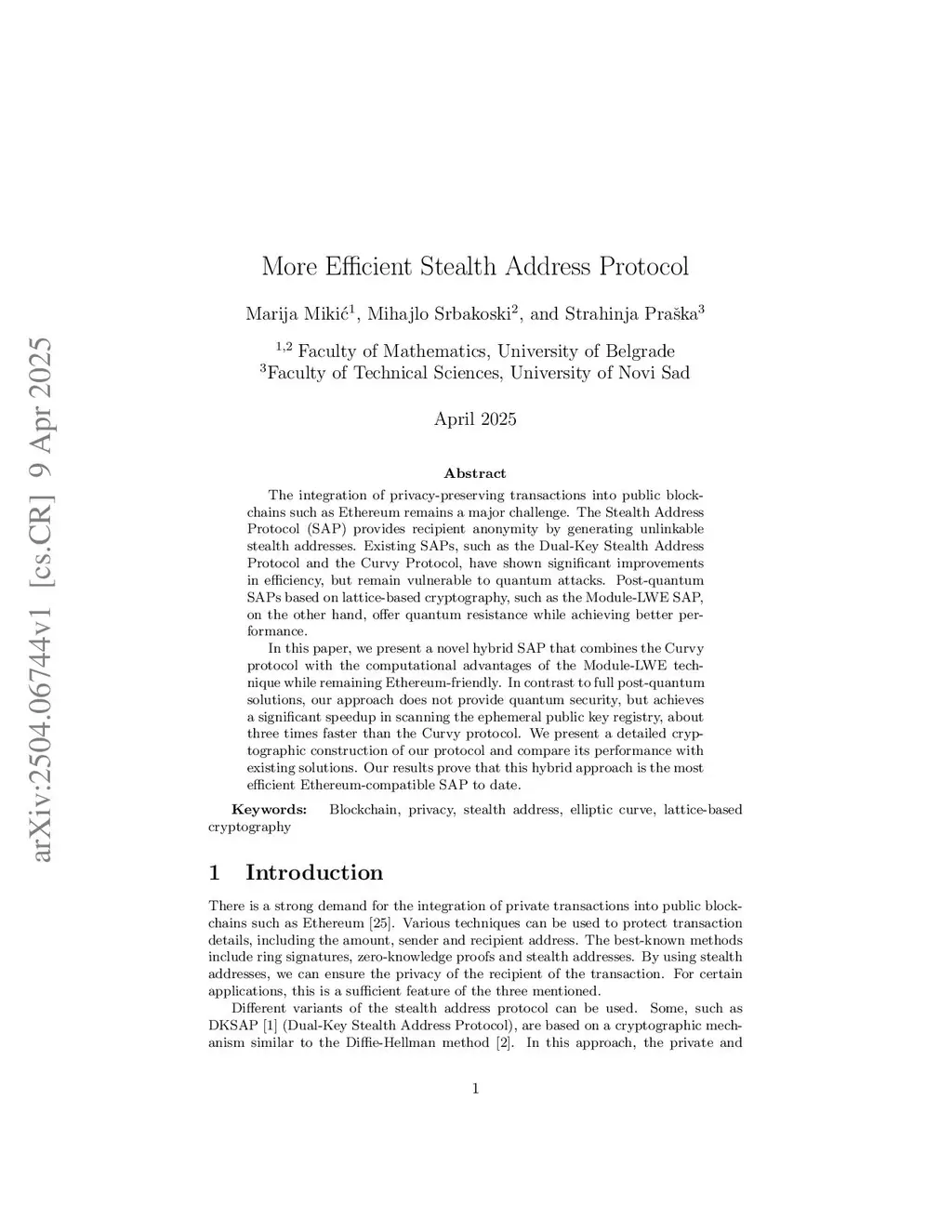 The integration of privacy-preserving transactions into public blockchains such as Ethereum remains a major challenge. The Stealth Address Protocol (SAP) provides recipient anonymity by generating unlinkable stealth addresses. Existing SAPs, such as the Dual-Key Stealth Address Protocol and the Curvy Protocol, have shown significant improvements in efficiency, but remain vulnerable to quantum attacks. Post-quantum SAPs based on lattice-based cryptography, such as the Module-LWE SAP, on the other hand, offer quantum resistance while achieving better performance.In this paper, we present a novel hybrid SAP that combines the Curvy protocol with the computational advantages of the Module-LWE technique while remaining Ethereum-friendly. In contrast to full post-quantum solutions, our approach does not provide quantum security, but achieves a significant speedup in scanning the ephemeral public key registry, about three times faster than the Curvy protocol. We present a detailed cryptographic construction of our protocol and compare its performance with existing solutions. Our results prove that this hybrid approach is the most efficient Ethereum-compatible SAP to date.