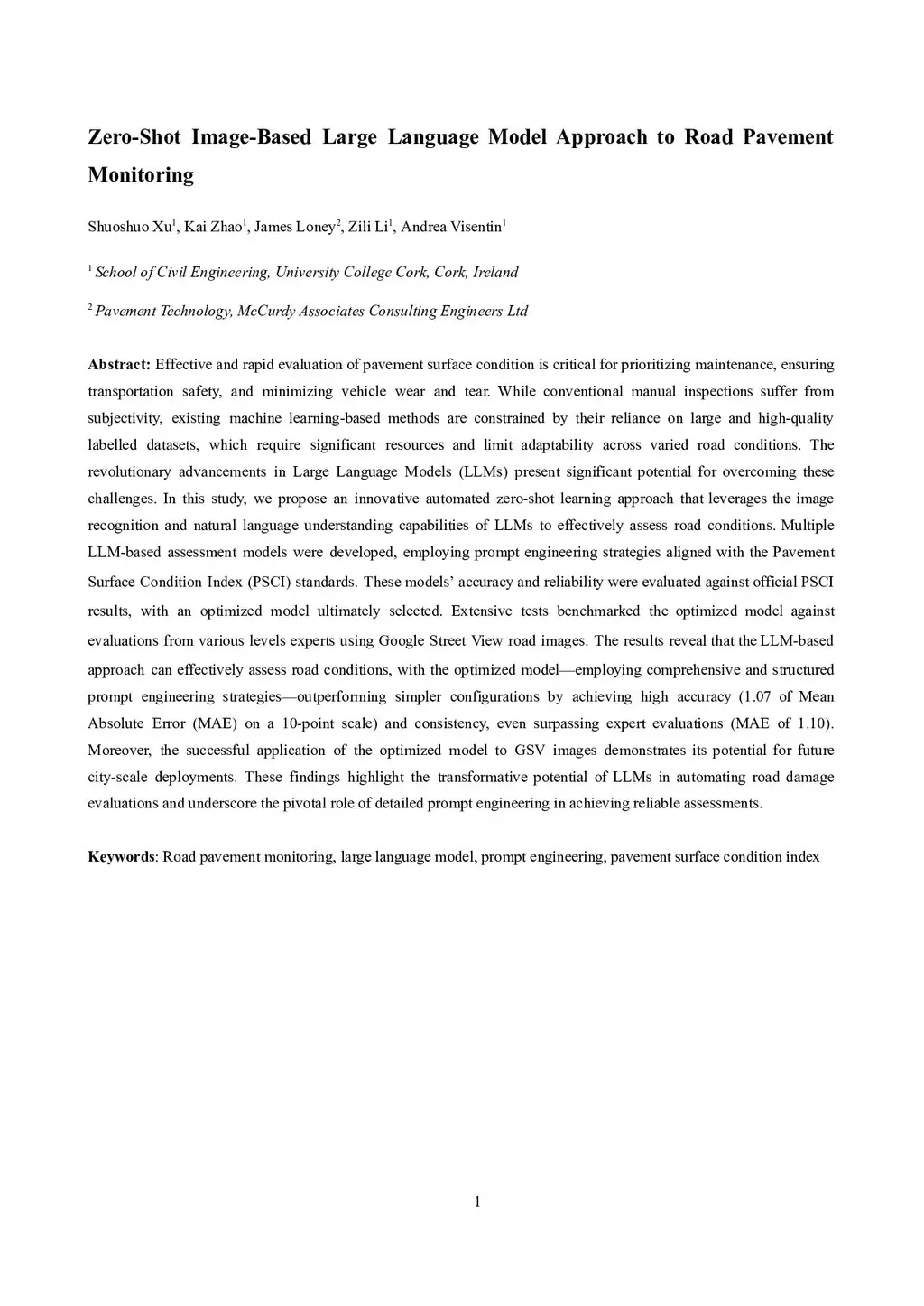 Effective and rapid evaluation of pavement surface condition is critical for prioritizing maintenance, ensuring transportation safety, and minimizing vehicle wear and tear. While conventional manual inspections suffer from subjectivity, existing machine learning-based methods are constrained by their reliance on large and high-quality labeled datasets, which require significant resources and limit adaptability across varied road conditions. The revolutionary advancements in Large Language Models (LLMs) present significant potential for overcoming these challenges. In this study, we propose an innovative automated zero-shot learning approach that leverages the image recognition and natural language understanding capabilities of LLMs to assess road conditions effectively. Multiple LLM-based assessment models were developed, employing prompt engineering strategies aligned with the Pavement Surface Condition Index (PSCI) standards. These models' accuracy and reliability were evaluated against official PSCI results, with an optimized model ultimately selected. Extensive tests benchmarked the optimized model against evaluations from various levels experts using Google Street View road images. The results reveal that the LLM-based approach can effectively assess road conditions, with the optimized model -employing comprehensive and structured prompt engineering strategies -outperforming simpler configurations by achieving high accuracy and consistency, even surpassing expert evaluations. Moreover, successfully applying the optimized model to Google Street View images demonstrates its potential for future city-scale deployments. These findings highlight the transformative potential of LLMs in automating road damage evaluations and underscore the pivotal role of detailed prompt engineering in achieving reliable assessments.
