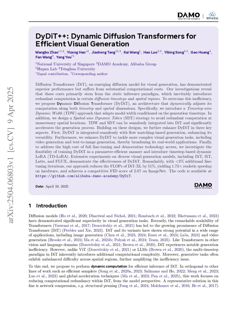 Diffusion Transformer (DiT), an emerging diffusion model for visual generation, has demonstrated superior performance but suffers from substantial computational costs. Our investigations reveal that these costs primarily stem from the static inference paradigm, which inevitably introduces redundant computation in certain diffusion timesteps and spatial regions. To overcome this inefficiency, we propose Dynamic Diffusion Transformer (DyDiT), an architecture that dynamically adjusts its computation along both timestep and spatial dimensions. Building on these designs, we present an extended version, DyDiT++, with improvements in three key aspects. First, it extends the generation mechanism of DyDiT beyond diffusion to flow matching, demonstrating that our method can also accelerate flow-matching-based generation, enhancing its versatility. Furthermore, we enhance DyDiT to tackle more complex visual generation tasks, including video generation and text-to-image generation, thereby broadening its real-world applications. Finally, to address the high cost of full fine-tuning and democratize technology access, we investigate the feasibility of training DyDiT in a parameter-efficient manner and introduce timestep-based dynamic LoRA (TD-LoRA). Extensive experiments on diverse visual generation models, including DiT, SiT, Latte, and FLUX, demonstrate the effectiveness of DyDiT++. Remarkably, with <3% additional fine-tuning iterations, our approach reduces the FLOPs of DiT-XL by 51%, yielding 1.73x realistic speedup on hardware, and achieves a competitive FID score of 2.07 on ImageNet. The code is available atthis https URL.