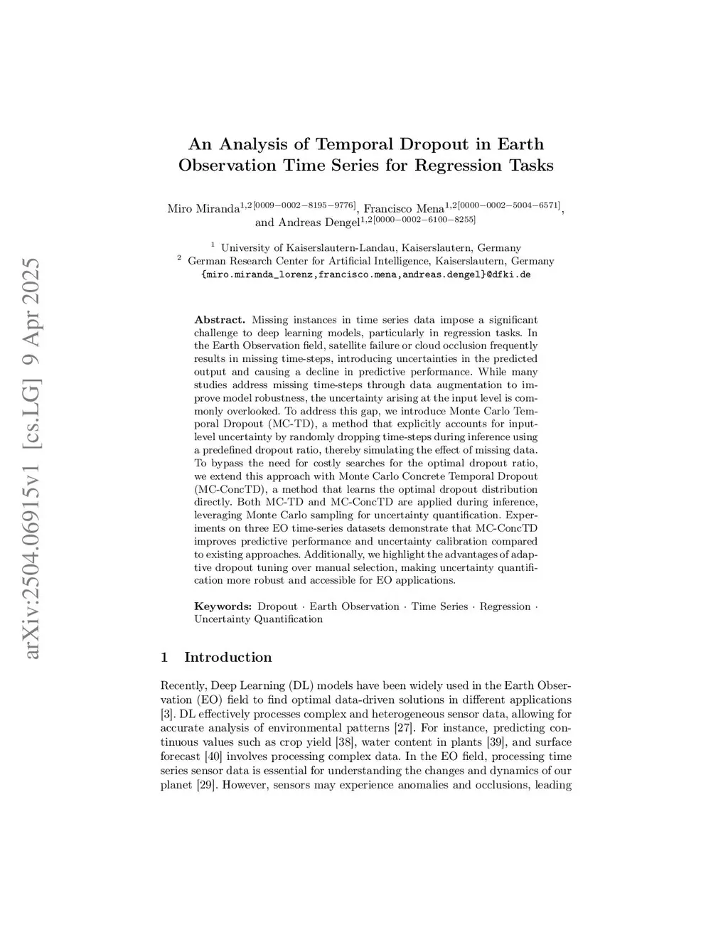 Missing instances in time series data impose a significant challenge to deep learning models, particularly in regression tasks. In the Earth Observation field, satellite failure or cloud occlusion frequently results in missing time-steps, introducing uncertainties in the predicted output and causing a decline in predictive performance. While many studies address missing time-steps through data augmentation to improve model robustness, the uncertainty arising at the input level is commonly overlooked. To address this gap, we introduce Monte Carlo Temporal Dropout (MC-TD), a method that explicitly accounts for input-level uncertainty by randomly dropping time-steps during inference using a predefined dropout ratio, thereby simulating the effect of missing data. To bypass the need for costly searches for the optimal dropout ratio, we extend this approach with Monte Carlo Concrete Temporal Dropout (MC-ConcTD), a method that learns the optimal dropout distribution directly. Both MC-TD and MC-ConcTD are applied during inference, leveraging Monte Carlo sampling for uncertainty quantification. Experiments on three EO time-series datasets demonstrate that MC-ConcTD improves predictive performance and uncertainty calibration compared to existing approaches. Additionally, we highlight the advantages of adaptive dropout tuning over manual selection, making uncertainty quantification more robust and accessible for EO applications.