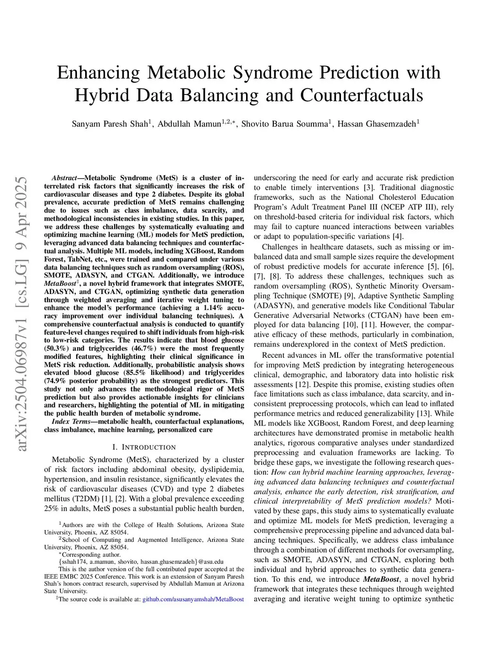 Metabolic Syndrome (MetS) is a cluster of interrelated risk factors that significantly increases the risk of cardiovascular diseases and type 2 diabetes. Despite its global prevalence, accurate prediction of MetS remains challenging due to issues such as class imbalance, data scarcity, and methodological inconsistencies in existing studies. In this paper, we address these challenges by systematically evaluating and optimizing machine learning (ML) models for MetS prediction, leveraging advanced data balancing techniques and counterfactual analysis. Multiple ML models, including XGBoost, Random Forest, TabNet, etc., were trained and compared under various data balancing techniques such as random oversampling (ROS), SMOTE, ADASYN, and CTGAN. Additionally, we introduce MetaBoost, a novel hybrid framework that integrates SMOTE, ADASYN, and CTGAN, optimizing synthetic data generation through weighted averaging and iterative weight tuning to enhance the model's performance (achieving up to a 1.87% accuracy improvement over individual balancing techniques). A comprehensive counterfactual analysis is conducted to quantify the feature-level changes required to shift individuals from high-risk to low-risk categories. The results indicate that blood glucose (50.3%) and triglycerides (46.7%) were the most frequently modified features, highlighting their clinical significance in MetS risk reduction. Additionally, probabilistic analysis shows elevated blood glucose (85.5% likelihood) and triglycerides (74.9% posterior probability) as the strongest predictors. This study not only advances the methodological rigor of MetS prediction but also provides actionable insights for clinicians and researchers, highlighting the potential of ML in mitigating the public health burden of metabolic syndrome.