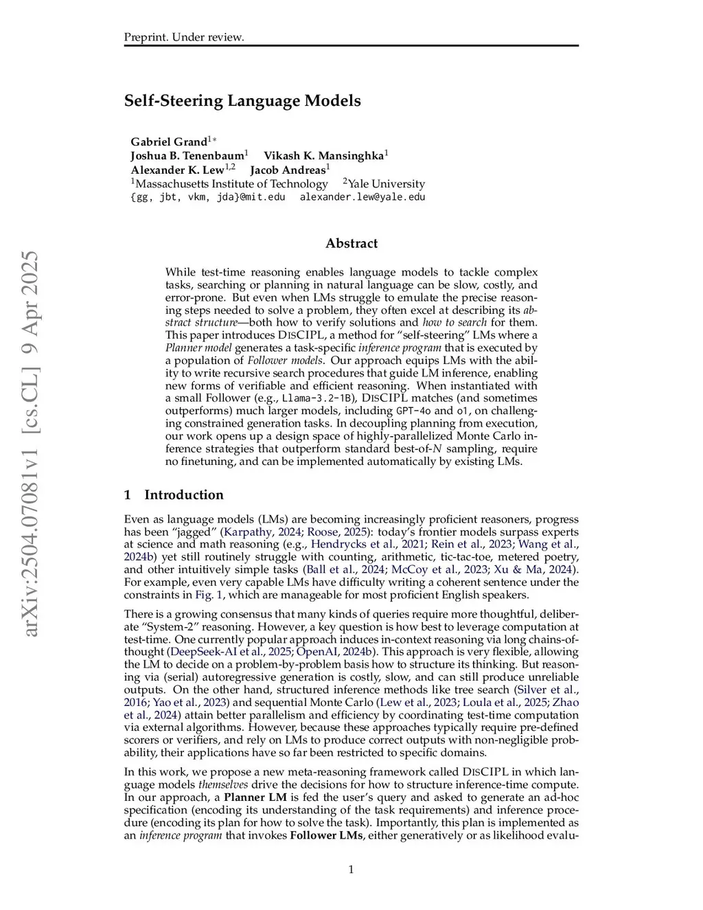 While test-time reasoning enables language models to tackle complex tasks, searching or planning in natural language can be slow, costly, and error-prone. But even when LMs struggle to emulate the precise reasoning steps needed to solve a problem, they often excel at describing its abstract structure--both how to verify solutions and how to search for them. This paper introduces DisCIPL, a method for "self-steering" LMs where a Planner model generates a task-specific inference program that is executed by a population of Follower models. Our approach equips LMs with the ability to write recursive search procedures that guide LM inference, enabling new forms of verifiable and efficient reasoning. When instantiated with a small Follower (e.g., Llama-3.2-1B), DisCIPL matches (and sometimes outperforms) much larger models, including GPT-4o and o1, on challenging constrained generation tasks. In decoupling planning from execution, our work opens up a design space of highly-parallelized Monte Carlo inference strategies that outperform standard best-of-N sampling, require no finetuning, and can be implemented automatically by existing LMs.