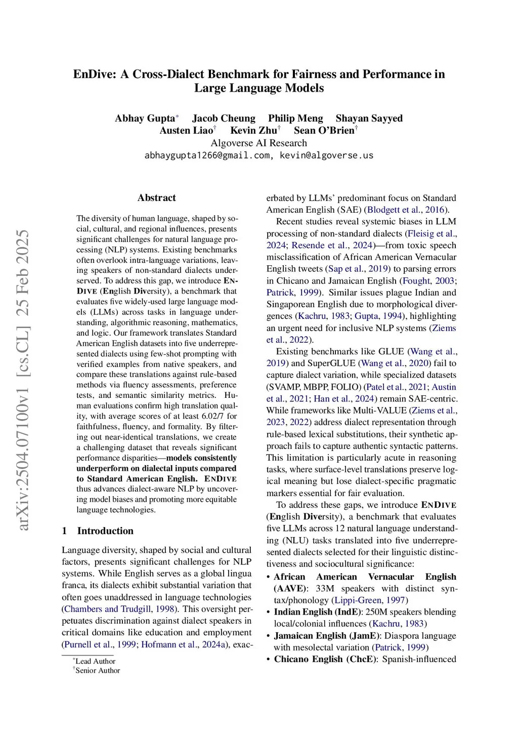 EnDive: A Cross-Dialect Benchmark for Fairness and Performance in Large Language Models