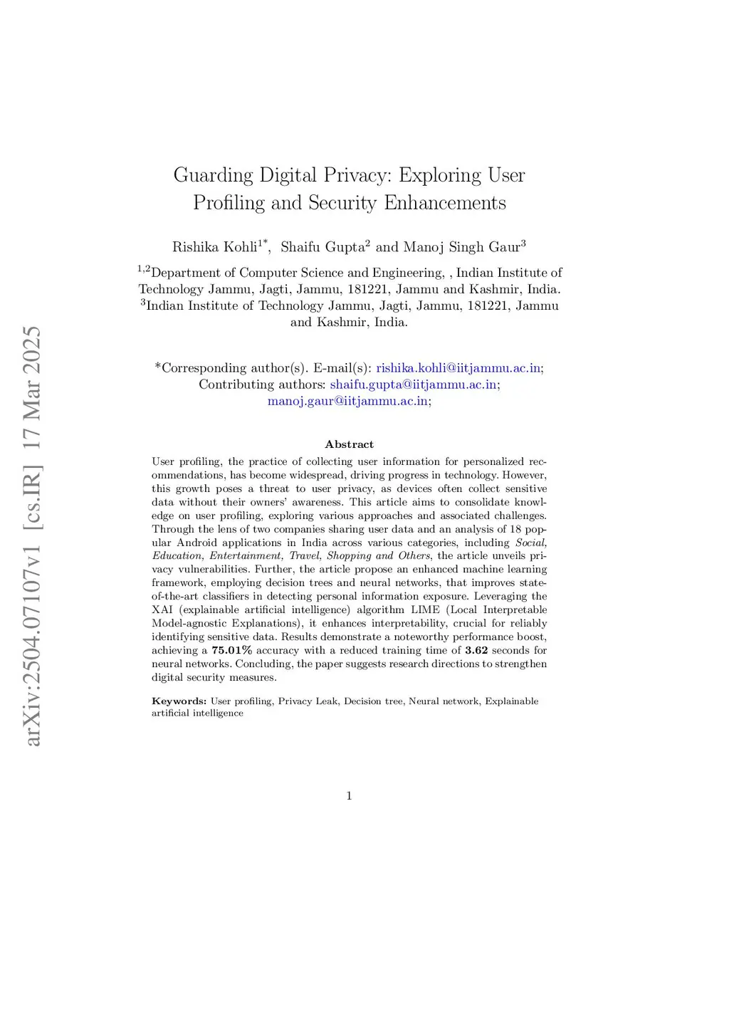 User profiling, the practice of collecting user information for personalized recommendations, has become widespread, driving progress in technology. However, this growth poses a threat to user privacy, as devices often collect sensitive data without their owners' awareness. This article aims to consolidate knowledge on user profiling, exploring various approaches and associated challenges. Through the lens of two companies sharing user data and an analysis of 18 popular Android applications in India across various categories, including , the article unveils privacy vulnerabilities. Further, the article propose an enhanced machine learning framework, employing decision trees and neural networks, that improves state-of-the-art classifiers in detecting personal information exposure. Leveraging the XAI (explainable artificial intelligence) algorithm LIME (Local Interpretable Model-agnostic Explanations), it enhances interpretability, crucial for reliably identifying sensitive data. Results demonstrate a noteworthy performance boost, achieving a accuracy with a reduced training time of seconds for neural networks. Concluding, the paper suggests research directions to strengthen digital security measures.