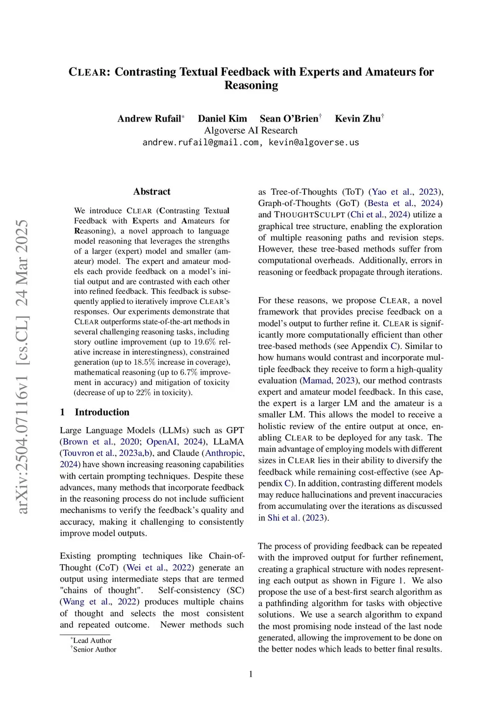 We introduce CLEAR (Contrasting Textual Feedback with Experts and Amateurs for Reasoning), a novel approach to language model reasoning that leverages the strengths of a larger (expert) model and smaller (amateur) model. The expert and amateur models each provide feedback on a model's initial output and are contrasted with each other into refined feedback. This feedback is subsequently applied to iteratively improve CLEAR's responses. Our experiments demonstrate that CLEAR outperforms state-of-the-art methods in several challenging reasoning tasks, including story outline improvement (up to 19.6% relative increase in interestingness), constrained generation (up to 18.5% increase in coverage), mathematical reasoning (up to 6.7% improvement in accuracy) and mitigation of toxicity (decrease of up to 22% in toxicity).