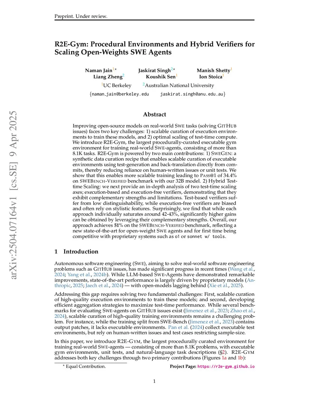 Improving open-source models on real-world SWE tasks (solving GITHUB issues) faces two key challenges: 1) scalable curation of execution environments to train these models, and, 2) optimal scaling of test-time compute. We introduce AgentGym, the largest procedurally-curated executable gym environment for training real-world SWE-agents, consisting of more than 8.7K tasks. AgentGym is powered by two main contributions: 1) SYNGEN: a synthetic data curation recipe that enables scalable curation of executable environments using test-generation and back-translation directly from commits, thereby reducing reliance on human-written issues or unit tests. We show that this enables more scalable training leading to pass@1 performance of 34.4% on SWE-Bench Verified benchmark with our 32B model. 2) Hybrid Test-time Scaling: we provide an in-depth analysis of two test-time scaling axes; execution-based and execution-free verifiers, demonstrating that they exhibit complementary strengths and limitations. Test-based verifiers suffer from low distinguishability, while execution-free verifiers are biased and often rely on stylistic features. Surprisingly, we find that while each approach individually saturates around 42-43%, significantly higher gains can be obtained by leveraging their complementary strengths. Overall, our approach achieves 51% on the SWE-Bench Verified benchmark, reflecting a new state-of-the-art for open-weight SWE-agents and for the first time showing competitive performance with proprietary models such as o1, o1-preview and sonnet-3.5-v2 (with tools). We will open-source our environments, models, and agent trajectories.