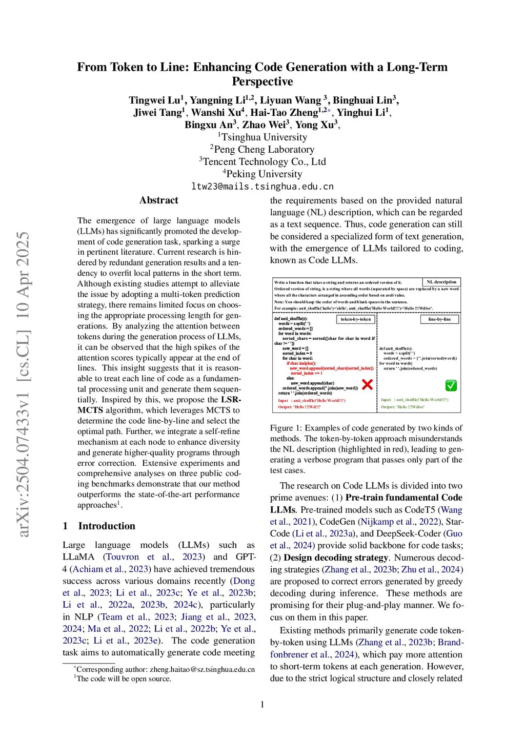 The emergence of large language models (LLMs) has significantly promoted the development of code generation task, sparking a surge in pertinent literature. Current research is hindered by redundant generation results and a tendency to overfit local patterns in the short term. Although existing studies attempt to alleviate the issue by adopting a multi-token prediction strategy, there remains limited focus on choosing the appropriate processing length for generations. By analyzing the attention between tokens during the generation process of LLMs, it can be observed that the high spikes of the attention scores typically appear at the end of lines. This insight suggests that it is reasonable to treat each line of code as a fundamental processing unit and generate them sequentially. Inspired by this, we propose the LSR-MCTS algorithm, which leverages MCTS to determine the code line-by-line and select the optimal path. Further, we integrate a self-refine mechanism at each node to enhance diversity and generate higher-quality programs through error correction. Extensive experiments and comprehensive analyses on three public coding benchmarks demonstrate that our method outperforms the state-of-the-art performance approaches.