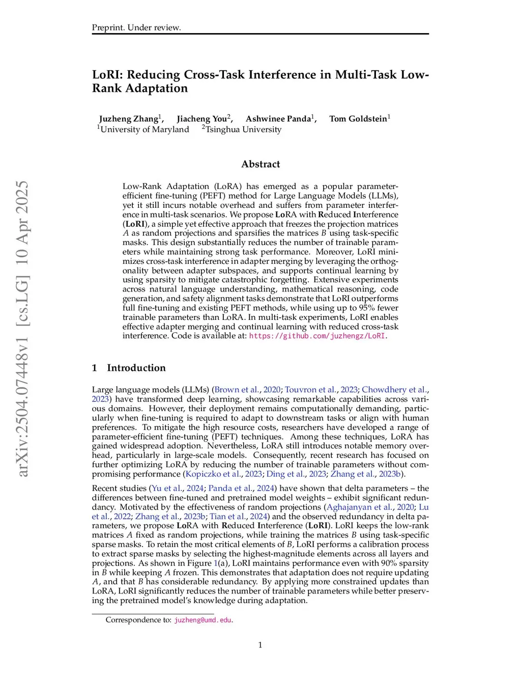 Low-Rank Adaptation (LoRA) has emerged as a popular parameter-efficient fine-tuning (PEFT) method for Large Language Models (LLMs), yet it still incurs notable overhead and suffers from parameter interference in multi-task scenarios. We propose LoRA with Reduced Interference (LoRI), a simple yet effective approach that freezes the projection matrices as random projections and sparsifies the matrices using task-specific masks. This design substantially reduces the number of trainable parameters while maintaining strong task performance. Moreover, LoRI minimizes cross-task interference in adapter merging by leveraging the orthogonality between adapter subspaces, and supports continual learning by using sparsity to mitigate catastrophic forgetting. Extensive experiments across natural language understanding, mathematical reasoning, code generation, and safety alignment tasks demonstrate that LoRI outperforms full fine-tuning and existing PEFT methods, while using up to 95% fewer trainable parameters than LoRA. In multi-task experiments, LoRI enables effective adapter merging and continual learning with reduced cross-task interference. Code is available at:this https URL