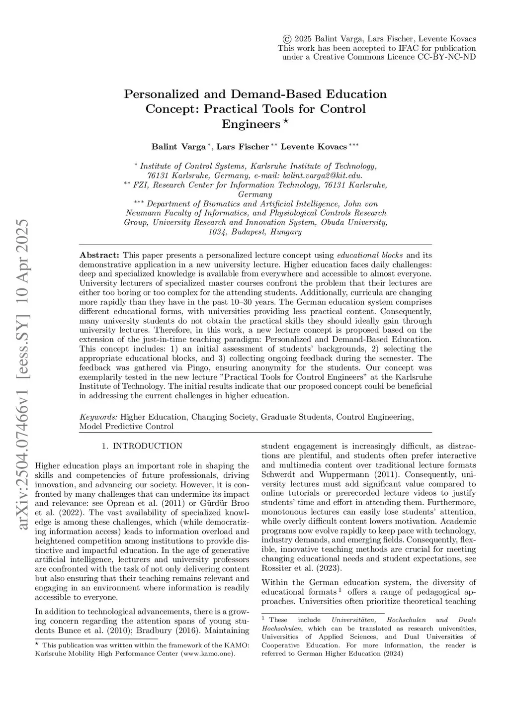 Personalized and Demand-Based Education Concept: Practical Tools for Control Engineers