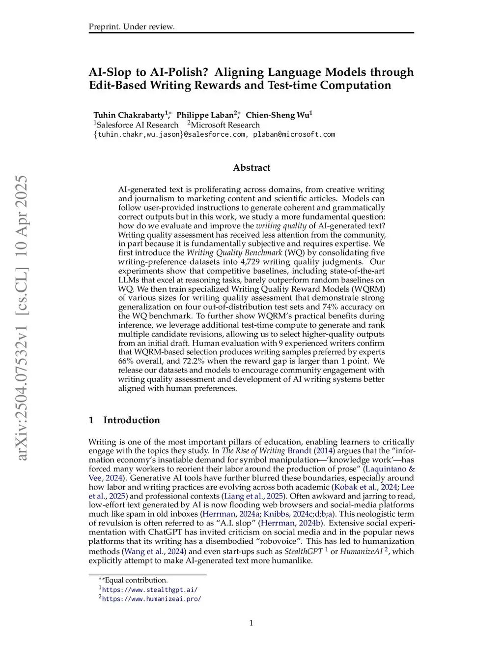 AI-Slop to AI-Polish? Aligning Language Models through Edit-Based Writing Rewards and Test-time Computation