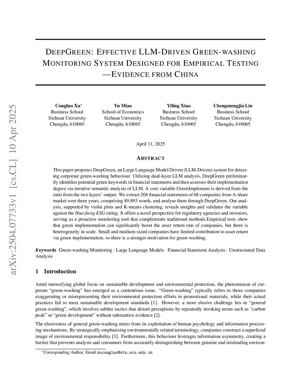 Motivated by the emerging adoption of Large Language Models (LLMs) in economics and management research, this paper investigates whether LLMs can reliably identify corporate greenwashing narratives and, more importantly, whether and how the greenwashing signals extracted from textual disclosures can be used to empirically identify causal effects. To this end, this paper proposes DeepGreen, a dual-stage LLM-Driven system for detecting potential corporate greenwashing in annual reports. Applied to 9369 A-share annual reports published between 2021 and 2023, DeepGreen attains high reliability in random-sample validation at both stages. Ablation experiment shows that Retrieval-Augmented Generation (RAG) reduces hallucinations, as compared to simply lengthening the input window. Empirical tests indicate that "greenwashing" captured by DeepGreen can effectively reveal a positive relationship between greenwashing and environmental penalties, and IV, PSM, Placebo test, which enhance the robustness and causal effects of the empirical evidence. Further study suggests that the presence and number of green investors can weaken the positive correlation between greenwashing and penalties. Heterogeneity analysis shows that the positive relationship between "greenwashing - penalty" is less significant in large-sized corporations and corporations that have accumulated green assets, indicating that these green assets may be exploited as a credibility shield for greenwashing. Our findings demonstrate that LLMs can standardize ESG oversight by early warning and direct regulators' scarce attention toward the subsets of corporations where monitoring is more warranted.