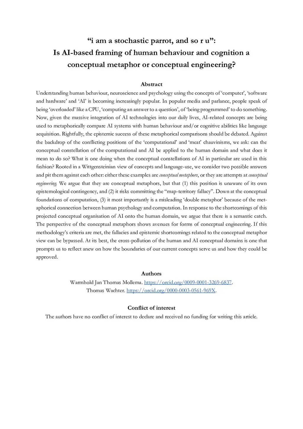 "i am a stochastic parrot, and so r u": Is AI-based framing of human behaviour and cognition a conceptual metaphor or conceptual engineering?