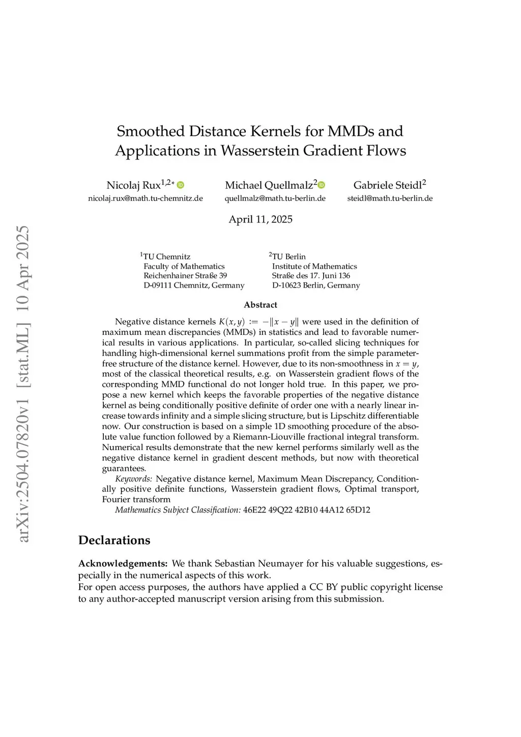 Negative distance kernels were used in the definition of maximum mean discrepancies (MMDs) in statistics and lead to favorable numerical results in various applications. In particular, so-called slicing techniques for handling high-dimensional kernel summations profit from the simple parameter-free structure of the distance kernel. However, due to its non-smoothness in , most of the classical theoretical results, e.g. on Wasserstein gradient flows of the corresponding MMD functional do not longer hold true. In this paper, we propose a new kernel which keeps the favorable properties of the negative distance kernel as being conditionally positive definite of order one with a nearly linear increase towards infinity and a simple slicing structure, but is Lipschitz differentiable now. Our construction is based on a simple 1D smoothing procedure of the absolute value function followed by a Riemann-Liouville fractional integral transform. Numerical results demonstrate that the new kernel performs similarly well as the negative distance kernel in gradient descent methods, but now with theoretical guarantees.