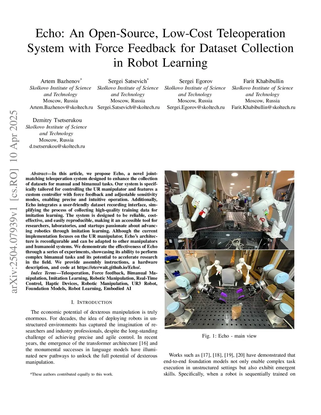 In this article, we propose Echo, a novel joint-matching teleoperation system designed to enhance the collection of datasets for manual and bimanual tasks. Our system is specifically tailored for controlling the UR manipulator and features a custom controller with force feedback and adjustable sensitivity modes, enabling precise and intuitive operation. Additionally, Echo integrates a user-friendly dataset recording interface, simplifying the process of collecting high-quality training data for imitation learning. The system is designed to be reliable, cost-effective, and easily reproducible, making it an accessible tool for researchers, laboratories, and startups passionate about advancing robotics through imitation learning. Although the current implementation focuses on the UR manipulator, Echo architecture is reconfigurable and can be adapted to other manipulators and humanoid systems. We demonstrate the effectiveness of Echo through a series of experiments, showcasing its ability to perform complex bimanual tasks and its potential to accelerate research in the field. We provide assembly instructions, a hardware description, and code atthis https URL.