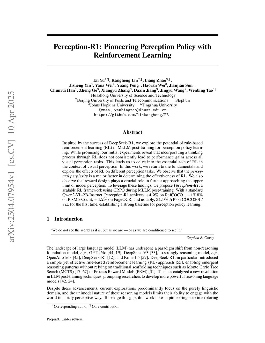 Perception-R1: Pioneering Perception Policy with Reinforcement Learning