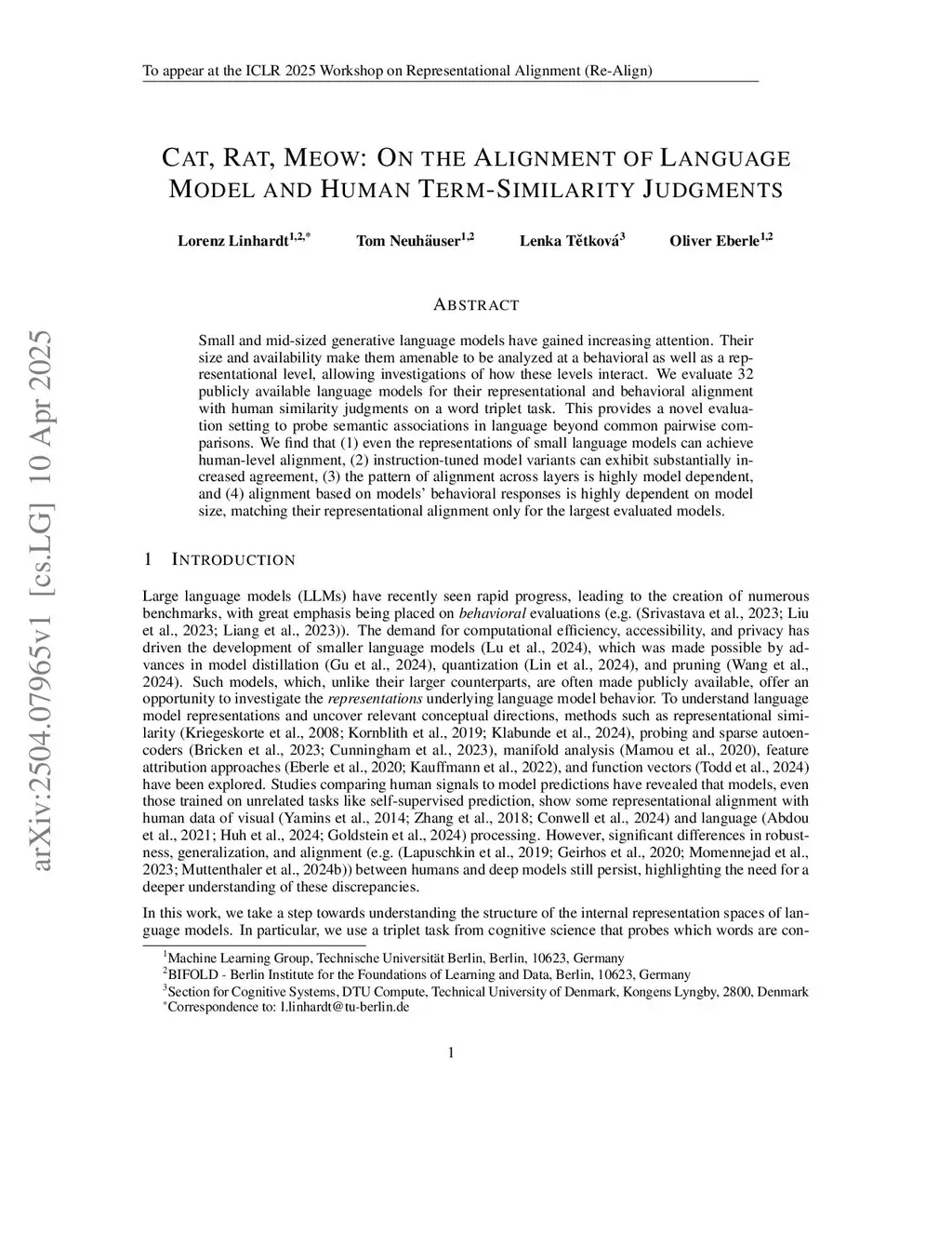 Small and mid-sized generative language models have gained increasing attention. Their size and availability make them amenable to being analyzed at a behavioral as well as a representational level, allowing investigations of how these levels interact. We evaluate 32 publicly available language models for their representational and behavioral alignment with human similarity judgments on a word triplet task. This provides a novel evaluation setting to probe semantic associations in language beyond common pairwise comparisons. We find that (1) even the representations of small language models can achieve human-level alignment, (2) instruction-tuned model variants can exhibit substantially increased agreement, (3) the pattern of alignment across layers is highly model dependent, and (4) alignment based on models' behavioral responses is highly dependent on model size, matching their representational alignment only for the largest evaluated models.