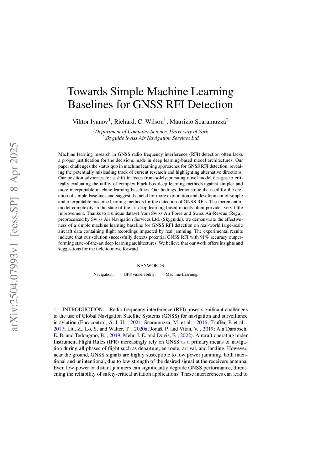 Machine learning research in GNSS radio frequency interference (RFI) detection often lacks a proper justification for the decisions made in deep learning-based model architectures. Our paper challenges the status quo in machine learning approaches for GNSS RFI detection, revealing the potentially misleading track of current research and highlighting alternative directions. Our position advocates for a shift in focus from solely pursuing novel model designs to critically evaluating the utility of complex black box deep learning methods against simpler and more interpretable machine learning baselines. Our findings demonstrate the need for the creation of simple baselines and suggest the need for more exploration and development of simple and interpretable machine learning methods for the detection of GNSS RFIs. The increment of model complexity in the state-of-the-art deep learning-based models often provides very little improvement. Thanks to a unique dataset from Swiss Air Force and Swiss Air-Rescue (Rega), preprocessed by Swiss Air Navigation Services Ltd. (Skyguide), we demonstrate the effectiveness of a simple machine learning baseline for GNSS RFI detection on real-world large-scale aircraft data containing flight recordings impacted by real jamming. The experimental results indicate that our solution successfully detects potential GNSS RFI with 91% accuracy outperforming state-of-the-art deep learning architectures. We believe that our work offers insights and suggestions for the field to move forward.
