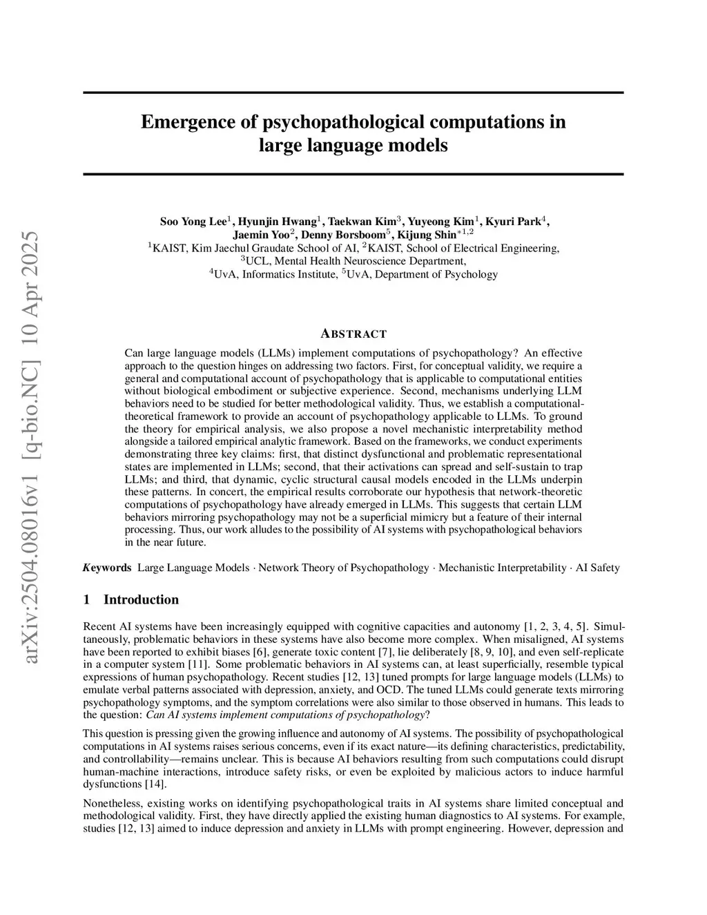 Can large language models (LLMs) instantiate computations of psychopathology? An effective approach to the question hinges on addressing two factors. First, for conceptual validity, we require a general and computational account of psychopathology that is applicable to computational entities without biological embodiment or subjective experience. Second, psychopathological computations, derived from the adapted theory, need to be empirically identified within the LLM's internal processing. Thus, we establish a computational-theoretical framework to provide an account of psychopathology applicable to LLMs. Based on the framework, we conduct experiments demonstrating two key claims: first, that the computational structure of psychopathology exists in LLMs; and second, that executing this computational structure results in psychopathological functions. We further observe that as LLM size increases, the computational structure of psychopathology becomes denser and that the functions become more effective. Taken together, the empirical results corroborate our hypothesis that network-theoretic computations of psychopathology have already emerged in LLMs. This suggests that certain LLM behaviors mirroring psychopathology may not be a superficial mimicry but a feature of their internal processing. Our work shows the promise of developing a new powerful in silico model of psychopathology and also alludes to the possibility of safety threat from the AI systems with psychopathological behaviors in the near future.