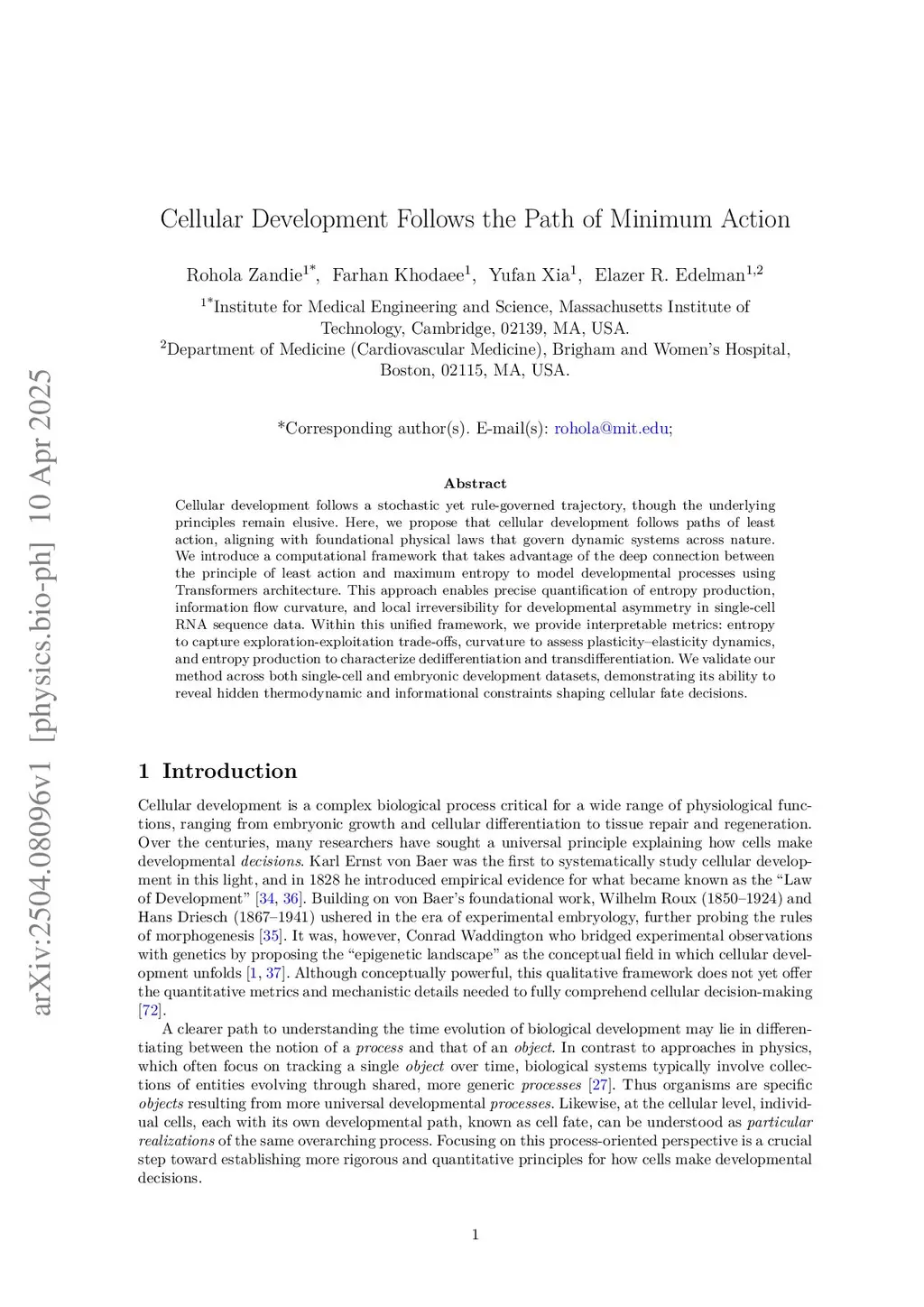 Cellular development follows a stochastic yet rule-governed trajectory, though the underlying principles remain elusive. Here, we propose that cellular development follows paths of least action, aligning with foundational physical laws that govern dynamic systems across nature. We introduce a computational framework that takes advantage of the deep connection between the principle of least action and maximum entropy to model developmental processes using Transformers architecture. This approach enables precise quantification of entropy production, information flow curvature, and local irreversibility for developmental asymmetry in single-cell RNA sequence data. Within this unified framework, we provide interpretable metrics: entropy to capture exploration-exploitation trade-offs, curvature to assess plasticity-elasticity dynamics, and entropy production to characterize dedifferentiation and transdifferentiation. We validate our method across both single-cell and embryonic development datasets, demonstrating its ability to reveal hidden thermodynamic and informational constraints shaping cellular fate decisions.