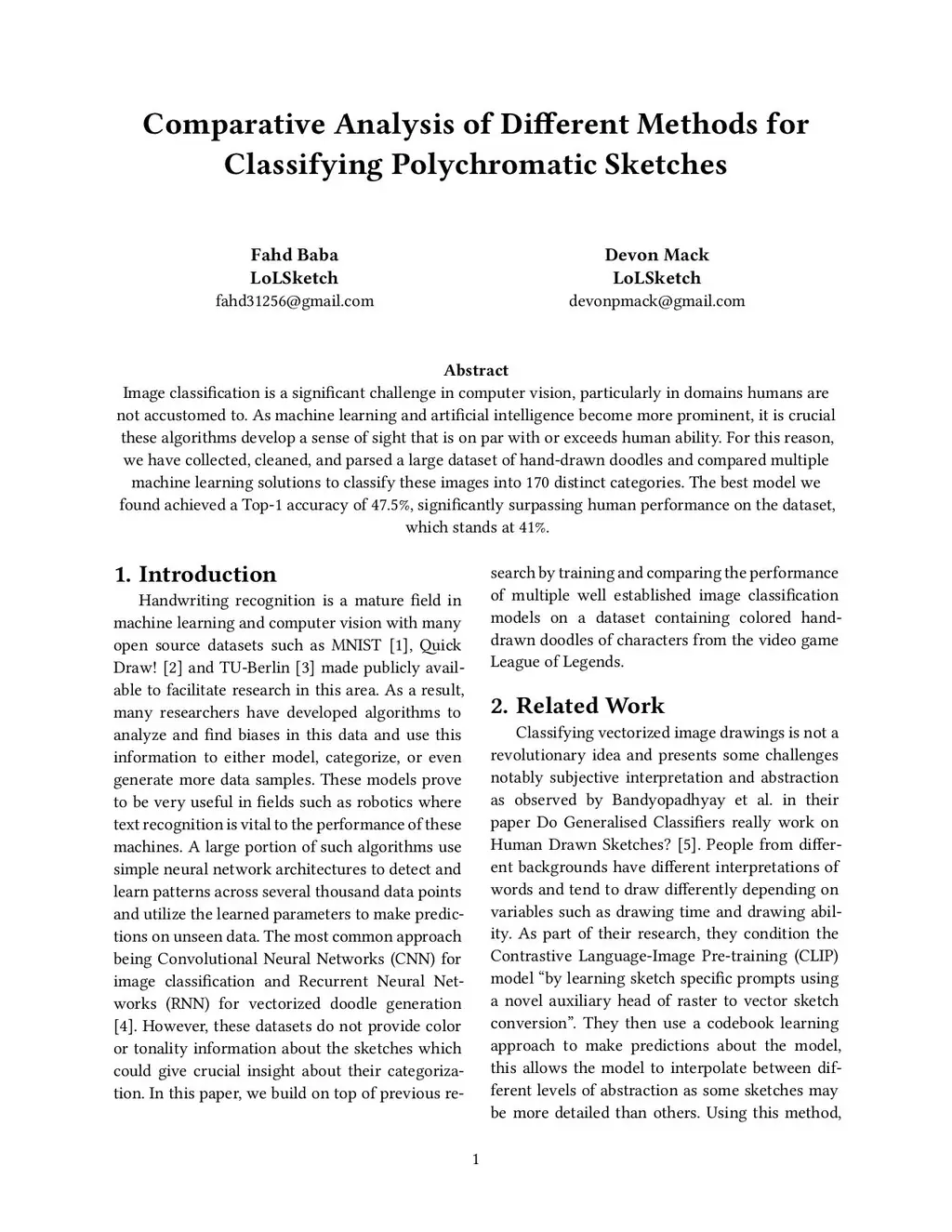 Image classification is a significant challenge in computer vision, particularly in domains humans are not accustomed to. As machine learning and artificial intelligence become more prominent, it is crucial these algorithms develop a sense of sight that is on par with or exceeds human ability. For this reason, we have collected, cleaned, and parsed a large dataset of hand-drawn doodles and compared multiple machine learning solutions to classify these images into 170 distinct categories. The best model we found achieved a Top-1 accuracy of 47.5%, significantly surpassing human performance on the dataset, which stands at 41%.