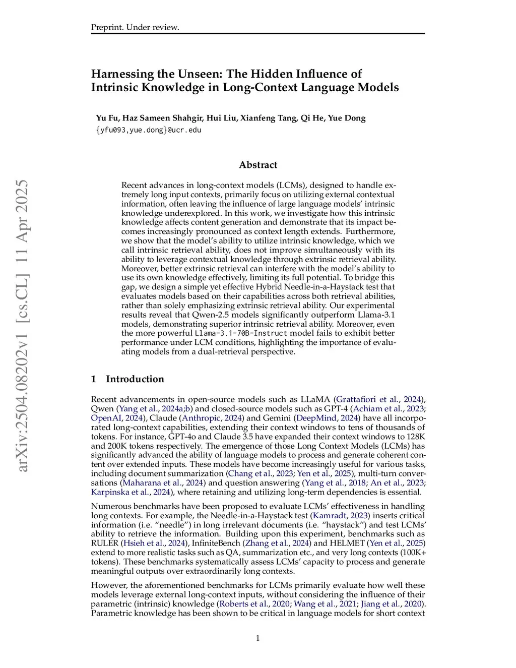 Recent advances in long-context language models (LCLMs), designed to handle extremely long contexts, primarily focus on utilizing external contextual information, often leaving the influence of language models' parametric knowledge underexplored. In this work, we firstly investigate how this parametric knowledge affects content generation and demonstrate that its impact becomes increasingly pronounced as context length extends. Furthermore, we show that the model's ability to utilize parametric knowledge, which we call parametric recall ability, does not improve simultaneously with its ability to leverage contextual knowledge through extrinsic retrieval ability. Moreover, better extrinsic retrieval ability can interfere with the model's parametric recall ability, limiting its full potential. To bridge this gap, we design a simple yet effective Hybrid Needle-in-a-Haystack test that evaluates models based on their capabilities across both abilities, rather than solely emphasizing extrinsic retrieval ability. Our experimental results reveal that Qwen-2.5 models significantly outperform Llama-3.1 models, demonstrating superior potential to combine various abilities. Moreover, even the more powerful Llama-3.1-70B-Instruct model fails to exhibit better performance, highlighting the importance of evaluating models from a dual-ability perspective.