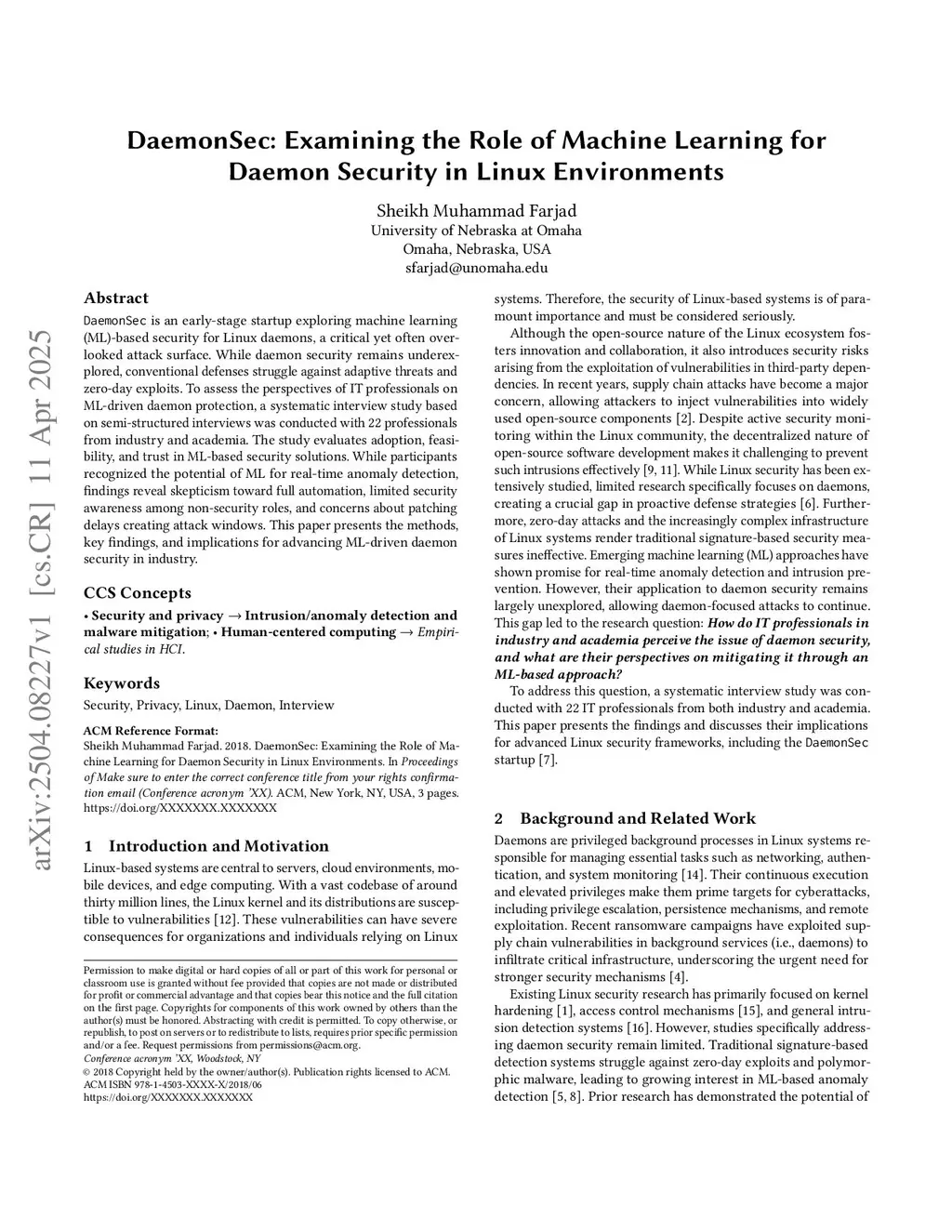 DaemonSec is an early-stage startup exploring machine learning (ML)-based security for Linux daemons, a critical yet often overlooked attack surface. While daemon security remains underexplored, conventional defenses struggle against adaptive threats and zero-day exploits. To assess the perspectives of IT professionals on ML-driven daemon protection, a systematic interview study based on semi-structured interviews was conducted with 22 professionals from industry and academia. The study evaluates adoption, feasibility, and trust in ML-based security solutions. While participants recognized the potential of ML for real-time anomaly detection, findings reveal skepticism toward full automation, limited security awareness among non-security roles, and concerns about patching delays creating attack windows. This paper presents the methods, key findings, and implications for advancing ML-driven daemon security in industry.