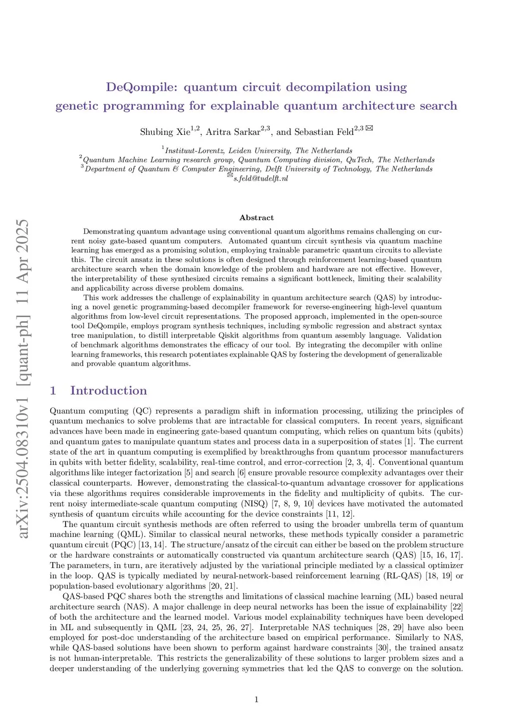 Demonstrating quantum advantage using conventional quantum algorithms remains challenging on current noisy gate-based quantum computers. Automated quantum circuit synthesis via quantum machine learning has emerged as a promising solution, employing trainable parametric quantum circuits to alleviate this. The circuit ansatz in these solutions is often designed through reinforcement learning-based quantum architecture search when the domain knowledge of the problem and hardware are not effective. However, the interpretability of these synthesized circuits remains a significant bottleneck, limiting their scalability and applicability across diverse problem domains.This work addresses the challenge of explainability in quantum architecture search (QAS) by introducing a novel genetic programming-based decompiler framework for reverse-engineering high-level quantum algorithms from low-level circuit representations. The proposed approach, implemented in the open-source tool DeQompile, employs program synthesis techniques, including symbolic regression and abstract syntax tree manipulation, to distill interpretable Qiskit algorithms from quantum assembly language. Validation of benchmark algorithms demonstrates the efficacy of our tool. By integrating the decompiler with online learning frameworks, this research potentiates explainable QAS by fostering the development of generalizable and provable quantum algorithms.