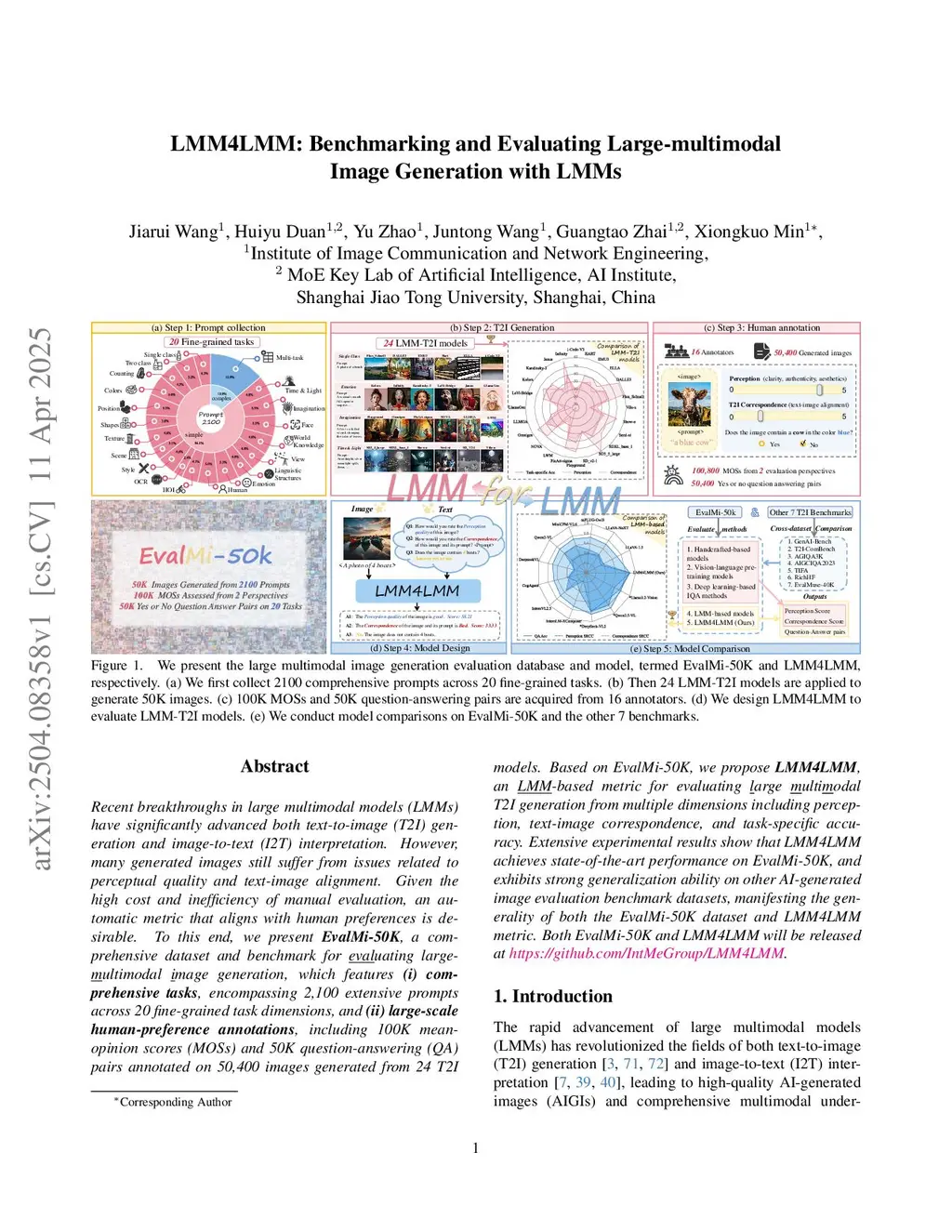 Recent breakthroughs in large multimodal models (LMMs) have significantly advanced both text-to-image (T2I) generation and image-to-text (I2T) interpretation. However, many generated images still suffer from issues related to perceptual quality and text-image alignment. Given the high cost and inefficiency of manual evaluation, an automatic metric that aligns with human preferences is desirable. To this end, we present EvalMi-50K, a comprehensive dataset and benchmark for evaluating large-multimodal image generation, which features (i) comprehensive tasks, encompassing 2,100 extensive prompts across 20 fine-grained task dimensions, and (ii) large-scale human-preference annotations, including 100K mean-opinion scores (MOSs) and 50K question-answering (QA) pairs annotated on 50,400 images generated from 24 T2I models. Based on EvalMi-50K, we propose LMM4LMM, an LMM-based metric for evaluating large multimodal T2I generation from multiple dimensions including perception, text-image correspondence, and task-specific accuracy. Extensive experimental results show that LMM4LMM achieves state-of-the-art performance on EvalMi-50K, and exhibits strong generalization ability on other AI-generated image evaluation benchmark datasets, manifesting the generality of both the EvalMi-50K dataset and LMM4LMM metric. Both EvalMi-50K and LMM4LMM will be released atthis https URL.