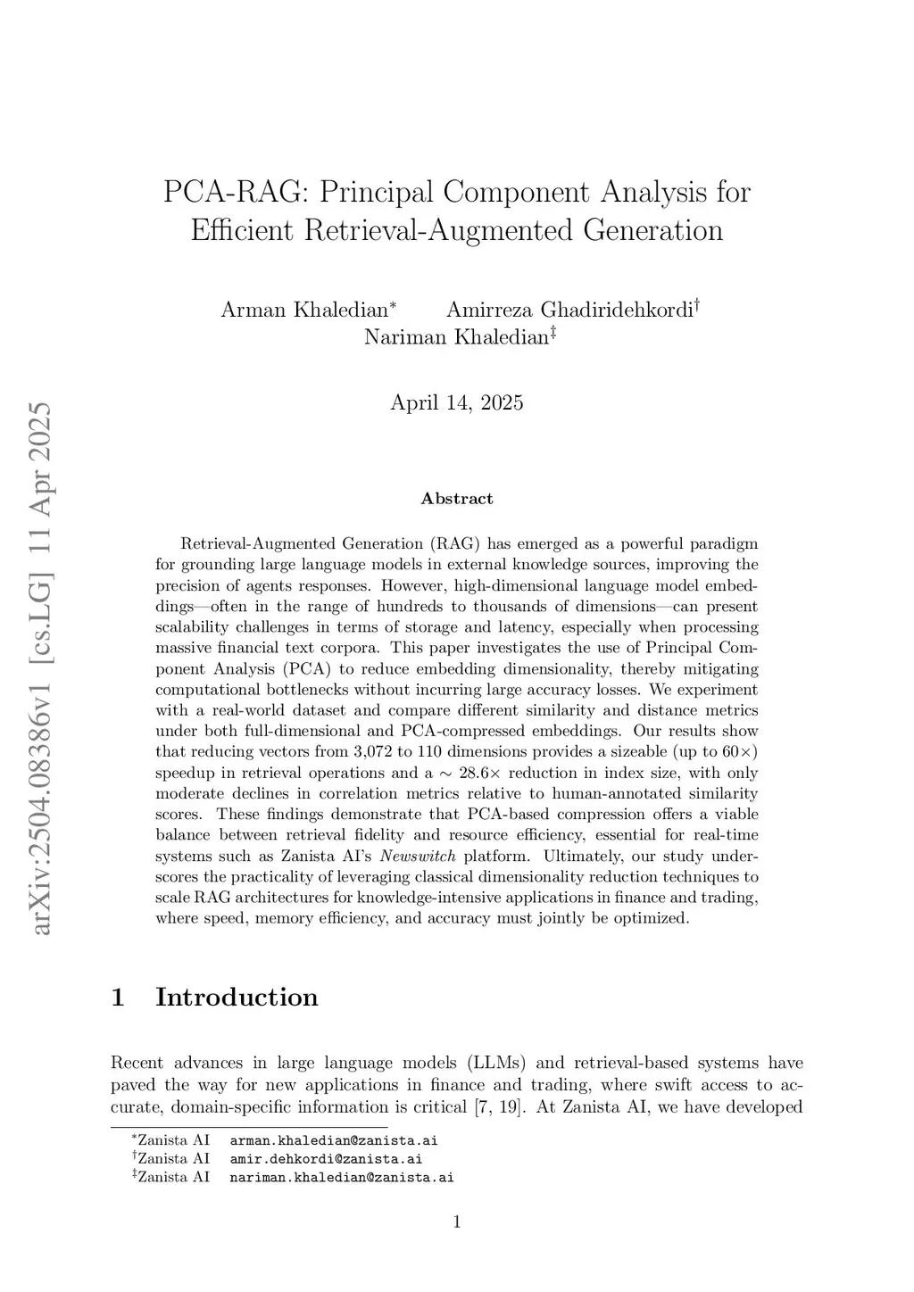 Retrieval-Augmented Generation (RAG) has emerged as a powerful paradigm for grounding large language models in external knowledge sources, improving the precision of agents responses. However, high-dimensional language model embeddings, often in the range of hundreds to thousands of dimensions, can present scalability challenges in terms of storage and latency, especially when processing massive financial text corpora. This paper investigates the use of Principal Component Analysis (PCA) to reduce embedding dimensionality, thereby mitigating computational bottlenecks without incurring large accuracy losses. We experiment with a real-world dataset and compare different similarity and distance metrics under both full-dimensional and PCA-compressed embeddings. Our results show that reducing vectors from 3,072 to 110 dimensions provides a sizeable (up to ) speedup in retrieval operations and a reduction in index size, with only moderate declines in correlation metrics relative to human-annotated similarity scores. These findings demonstrate that PCA-based compression offers a viable balance between retrieval fidelity and resource efficiency, essential for real-time systems such as Zanista AI's \textit{Newswitch} platform. Ultimately, our study underscores the practicality of leveraging classical dimensionality reduction techniques to scale RAG architectures for knowledge-intensive applications in finance and trading, where speed, memory efficiency, and accuracy must jointly be optimized.