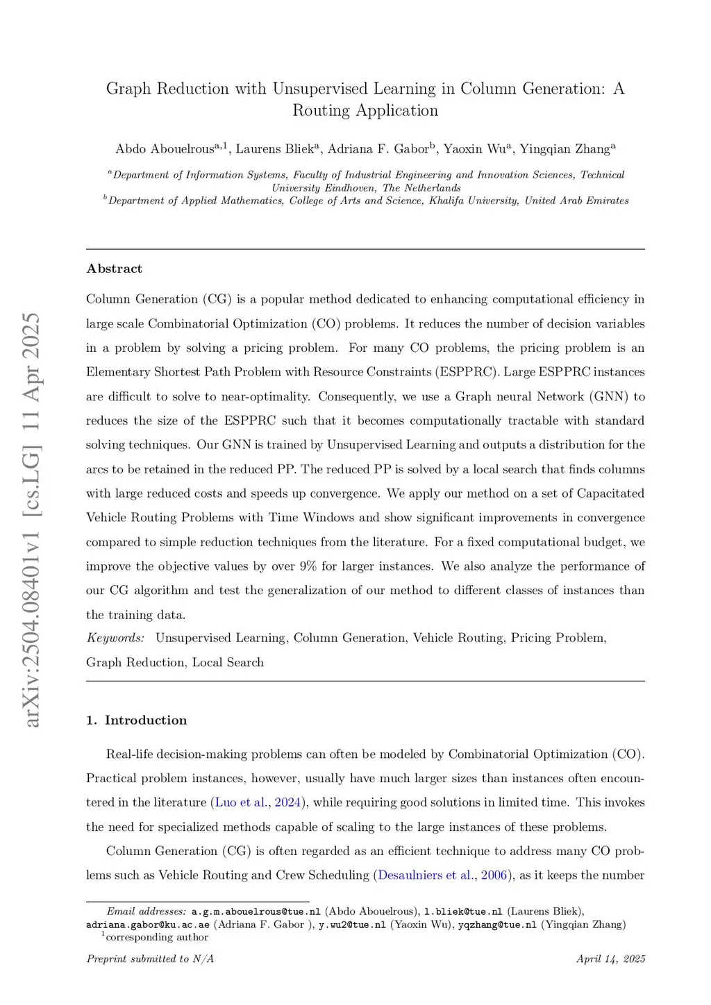 Graph Reduction with Unsupervised Learning in Column Generation: A Routing Application