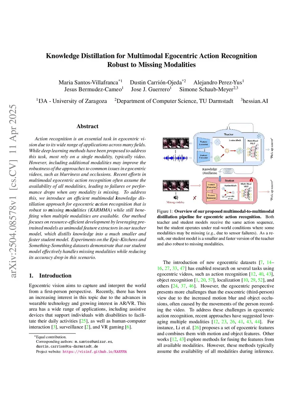 Egocentric action recognition enables robots to facilitate human-robot interactions and monitor task progress. Existing methods often rely solely on RGB videos, although additional modalities, such as audio, can improve accuracy under challenging conditions. However, most multimodal approaches assume that all modalities are available at inference time, leading to significant accuracy drops, or even failure, when inputs are missing. To address this limitation, we introduce KARMMA, a multimodal Knowledge distillation framework for egocentric Action Recognition robust to Missing ModAlities that does not require modality alignment across all samples during training or inference. KARMMA distills knowledge from a multimodal teacher into a multimodal student that leverages all available modalities while remaining robust to missing ones, enabling deployment across diverse sensor configurations without retraining. Our student uses approximately 50% fewer computational resources than the teacher, resulting in a lightweight and fast model that is well suited for on-robot deployment. Experiments on Epic-Kitchens and Something-Something demonstrate that our student achieves competitive accuracy while significantly reducing performance degradation under missing modality conditions.