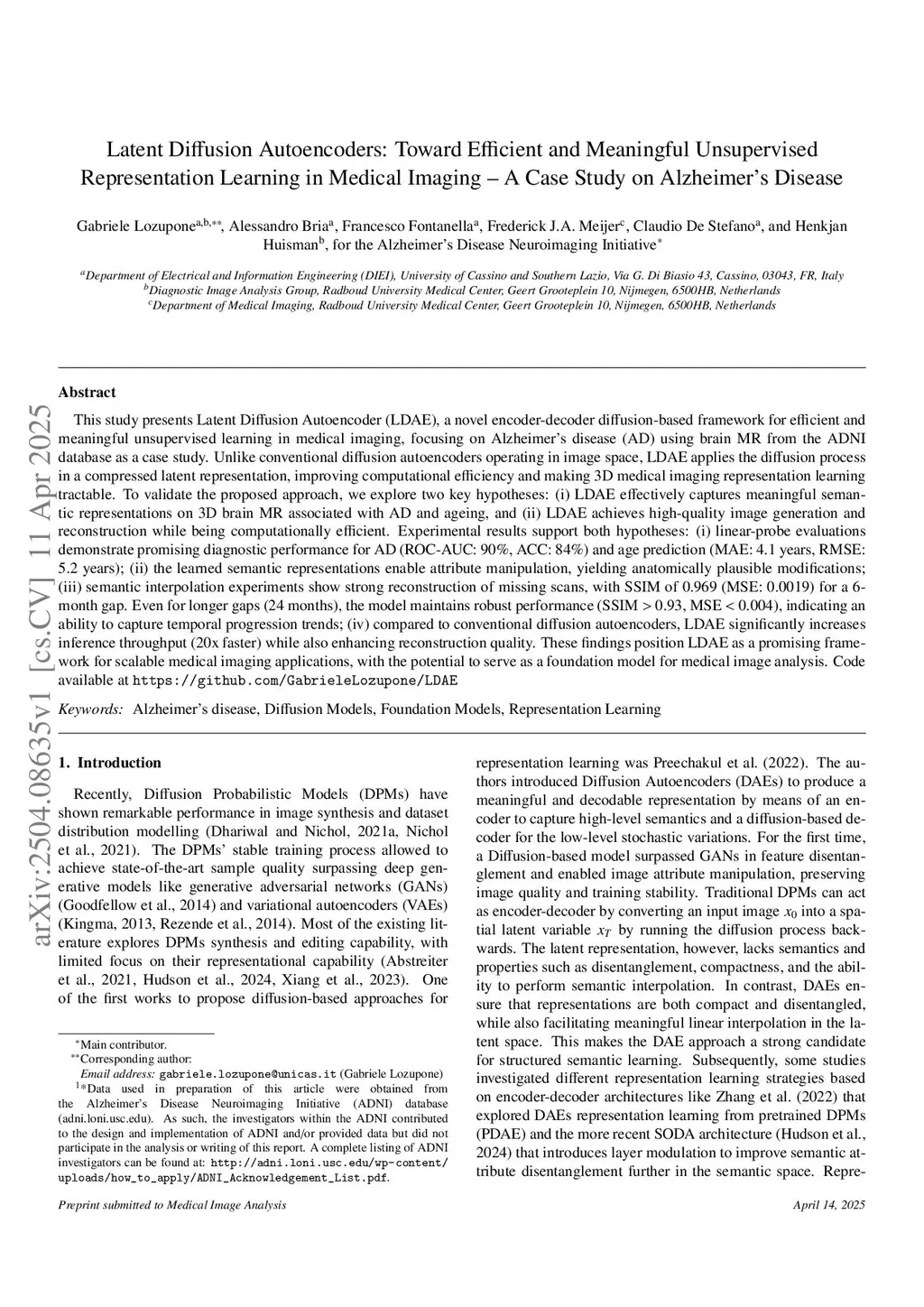 This study presents Latent Diffusion Autoencoder (LDAE), a novel encoder-decoder diffusion-based framework for efficient and meaningful unsupervised learning in medical imaging, focusing on Alzheimer disease (AD) using brain MR from the ADNI database as a case study. Unlike conventional diffusion autoencoders operating in image space, LDAE applies the diffusion process in a compressed latent representation, improving computational efficiency and making 3D medical imaging representation learning tractable. To validate the proposed approach, we explore two key hypotheses: (i) LDAE effectively captures meaningful semantic representations on 3D brain MR associated with AD and ageing, and (ii) LDAE achieves high-quality image generation and reconstruction while being computationally efficient. Experimental results support both hypotheses: (i) linear-probe evaluations demonstrate promising diagnostic performance for AD (ROC-AUC: 90%, ACC: 84%) and age prediction (MAE: 4.1 years, RMSE: 5.2 years); (ii) the learned semantic representations enable attribute manipulation, yielding anatomically plausible modifications; (iii) semantic interpolation experiments show strong reconstruction of missing scans, with SSIM of 0.969 (MSE: 0.0019) for a 6-month gap. Even for longer gaps (24 months), the model maintains robust performance (SSIM > 0.93, MSE < 0.004), indicating an ability to capture temporal progression trends; (iv) compared to conventional diffusion autoencoders, LDAE significantly increases inference throughput (20x faster) while also enhancing reconstruction quality. These findings position LDAE as a promising framework for scalable medical imaging applications, with the potential to serve as a foundation model for medical image analysis. Code available atthis https URL