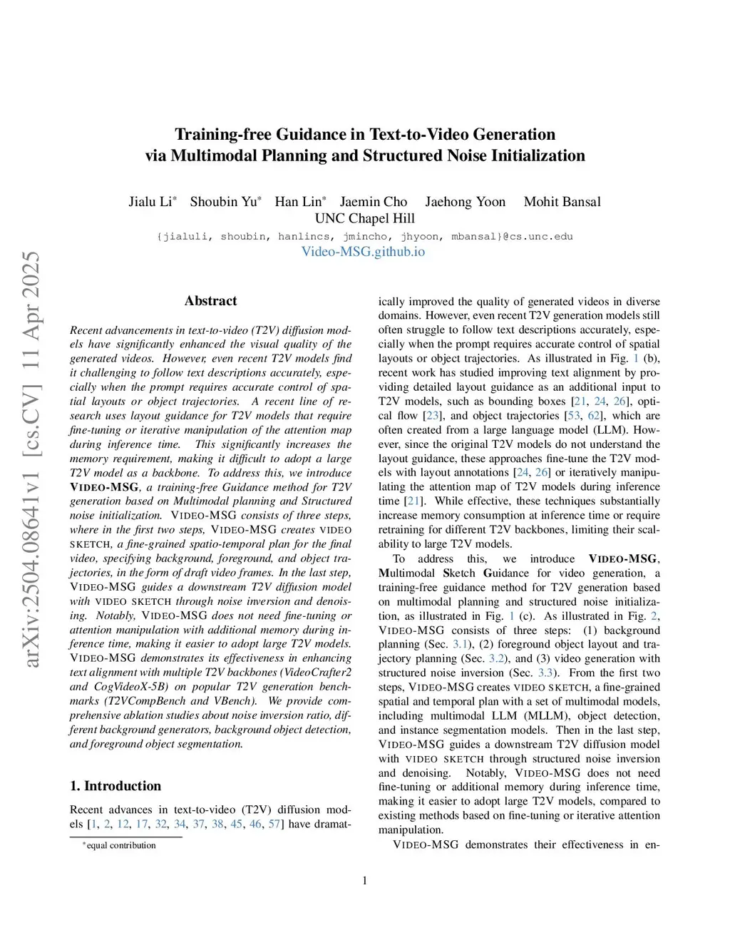 Recent advancements in text-to-video (T2V) diffusion models have significantly enhanced the visual quality of the generated videos. However, even recent T2V models find it challenging to follow text descriptions accurately, especially when the prompt requires accurate control of spatial layouts or object trajectories. A recent line of research uses layout guidance for T2V models that require fine-tuning or iterative manipulation of the attention map during inference time. This significantly increases the memory requirement, making it difficult to adopt a large T2V model as a backbone. To address this, we introduce Video-MSG, a training-free Guidance method for T2V generation based on Multimodal planning and Structured noise initialization. Video-MSG consists of three steps, where in the first two steps, Video-MSG creates Video Sketch, a fine-grained spatio-temporal plan for the final video, specifying background, foreground, and object trajectories, in the form of draft video frames. In the last step, Video-MSG guides a downstream T2V diffusion model with Video Sketch through noise inversion and denoising. Notably, Video-MSG does not need fine-tuning or attention manipulation with additional memory during inference time, making it easier to adopt large T2V models. Video-MSG demonstrates its effectiveness in enhancing text alignment with multiple T2V backbones (VideoCrafter2 and CogVideoX-5B) on popular T2V generation benchmarks (T2VCompBench and VBench). We provide comprehensive ablation studies about noise inversion ratio, different background generators, background object detection, and foreground object segmentation.