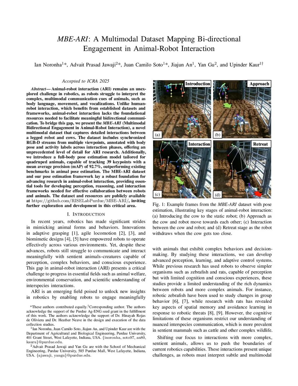 Animal-robot interaction (ARI) remains an unexplored challenge in robotics, as robots struggle to interpret the complex, multimodal communication cues of animals, such as body language, movement, and vocalizations. Unlike human-robot interaction, which benefits from established datasets and frameworks, animal-robot interaction lacks the foundational resources needed to facilitate meaningful bidirectional communication. To bridge this gap, we present the MBE-ARI (Multimodal Bidirectional Engagement in Animal-Robot Interaction), a novel multimodal dataset that captures detailed interactions between a legged robot and cows. The dataset includes synchronized RGB-D streams from multiple viewpoints, annotated with body pose and activity labels across interaction phases, offering an unprecedented level of detail for ARI research. Additionally, we introduce a full-body pose estimation model tailored for quadruped animals, capable of tracking 39 keypoints with a mean average precision (mAP) of 92.7%, outperforming existing benchmarks in animal pose estimation. The MBE-ARI dataset and our pose estimation framework lay a robust foundation for advancing research in animal-robot interaction, providing essential tools for developing perception, reasoning, and interaction frameworks needed for effective collaboration between robots and animals. The dataset and resources are publicly available atthis https URL, inviting further exploration and development in this critical area.