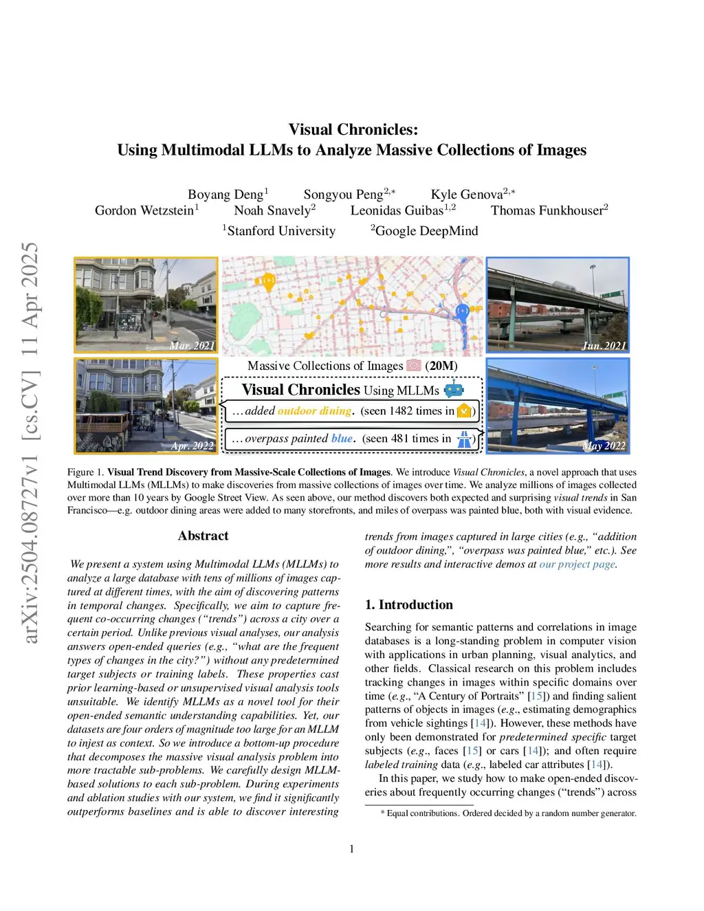 We present a system using Multimodal LLMs (MLLMs) to analyze a large database with tens of millions of images captured at different times, with the aim of discovering patterns in temporal changes. Specifically, we aim to capture frequent co-occurring changes ("trends") across a city over a certain period. Unlike previous visual analyses, our analysis answers open-ended queries (e.g., "what are the frequent types of changes in the city?") without any predetermined target subjects or training labels. These properties cast prior learning-based or unsupervised visual analysis tools unsuitable. We identify MLLMs as a novel tool for their open-ended semantic understanding capabilities. Yet, our datasets are four orders of magnitude too large for an MLLM to ingest as context. So we introduce a bottom-up procedure that decomposes the massive visual analysis problem into more tractable sub-problems. We carefully design MLLM-based solutions to each sub-problem. During experiments and ablation studies with our system, we find it significantly outperforms baselines and is able to discover interesting trends from images captured in large cities (e.g., "addition of outdoor dining,", "overpass was painted blue," etc.). See more results and interactive demos atthis https URL.