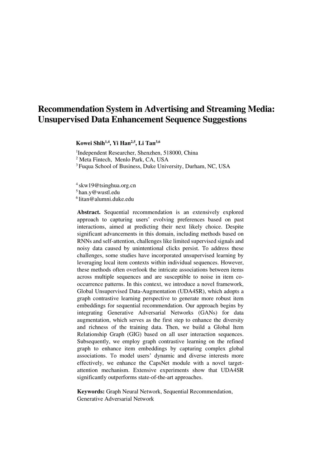 Recommendation System in Advertising and Streaming Media: Unsupervised Data Enhancement Sequence Suggestions