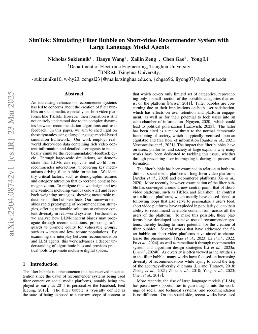 An increasing reliance on recommender systems has led to concerns about the creation of filter bubbles on social media, especially on short video platforms like TikTok. However, their formation is still not entirely understood due to the complex dynamics between recommendation algorithms and user feedback. In this paper, we aim to shed light on these dynamics using a large language model-based simulation framework. Our work employs real-world short-video data containing rich video content information and detailed user-agents to realistically simulate the recommendation-feedback cycle. Through large-scale simulations, we demonstrate that LLMs can replicate real-world user-recommender interactions, uncovering key mechanisms driving filter bubble formation. We identify critical factors, such as demographic features and category attraction that exacerbate content homogenization. To mitigate this, we design and test interventions including various cold-start and feedback weighting strategies, showing measurable reductions in filter bubble effects. Our framework enables rapid prototyping of recommendation strategies, offering actionable solutions to enhance content diversity in real-world systems. Furthermore, we analyze how LLM-inherent biases may propagate through recommendations, proposing safeguards to promote equity for vulnerable groups, such as women and low-income populations. By examining the interplay between recommendation and LLM agents, this work advances a deeper understanding of algorithmic bias and provides practical tools to promote inclusive digital spaces.