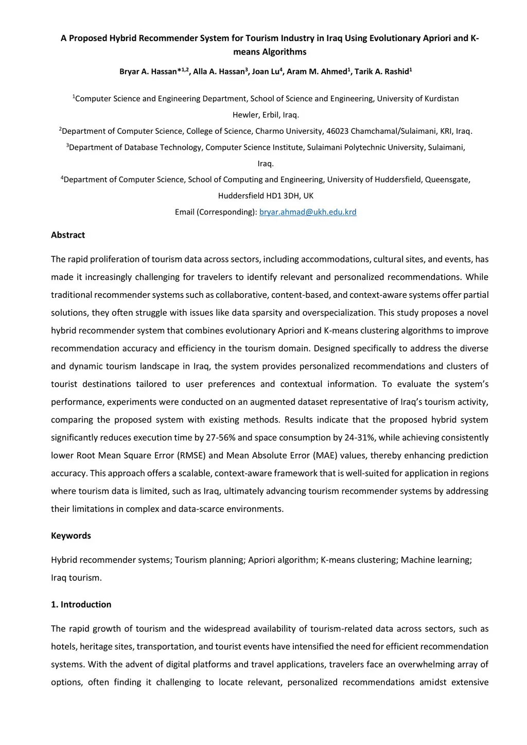 The rapid proliferation of tourism data across sectors, including accommodations, cultural sites, and events, has made it increasingly challenging for travelers to identify relevant and personalized recommendations. While traditional recommender systems such as collaborative, content-based, and context-aware systems offer partial solutions, they often struggle with issues like data sparsity and overspecialization. This study proposes a novel hybrid recommender system that combines evolutionary Apriori and K-means clustering algorithms to improve recommendation accuracy and efficiency in the tourism domain. Designed specifically to address the diverse and dynamic tourism landscape in Iraq, the system provides personalized recommendations and clusters of tourist destinations tailored to user preferences and contextual information. To evaluate the systems performance, experiments were conducted on an augmented dataset representative of Iraqs tourism activity, comparing the proposed system with existing methods. Results indicate that the proposed hybrid system significantly reduces execution time by 27-56% and space consumption by 24-31%, while achieving consistently lower Root Mean Square Error (RMSE) and Mean Absolute Error (MAE) values, thereby enhancing prediction accuracy. This approach offers a scalable, context-aware framework that is well-suited for application in regions where tourism data is limited, such as Iraq, ultimately advancing tourism recommender systems by addressing their limitations in complex and data-scarce environments.