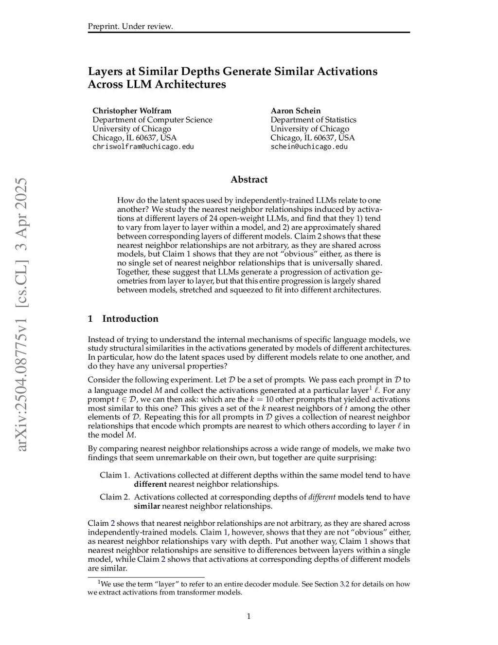 How do the latent spaces used by independently-trained LLMs relate to one another? We study the nearest neighbor relationships induced by activations at different layers of 24 open-weight LLMs, and find that they 1) tend to vary from layer to layer within a model, and 2) are approximately shared between corresponding layers of different models. Claim 2 shows that these nearest neighbor relationships are not arbitrary, as they are shared across models, but Claim 1 shows that they are not "obvious" either, as there is no single set of nearest neighbor relationships that is universally shared. Together, these suggest that LLMs generate a progression of activation geometries from layer to layer, but that this entire progression is largely shared between models, stretched and squeezed to fit into different architectures.