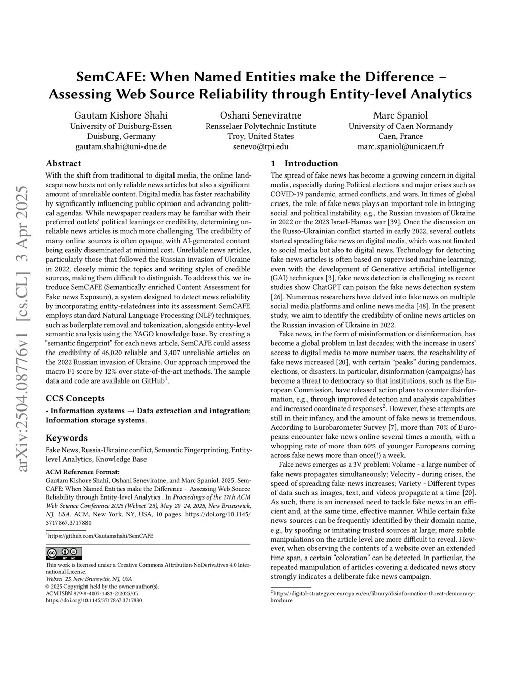 SemCAFE: When Named Entities make the Difference Assessing Web Source Reliability through Entity-level Analytics