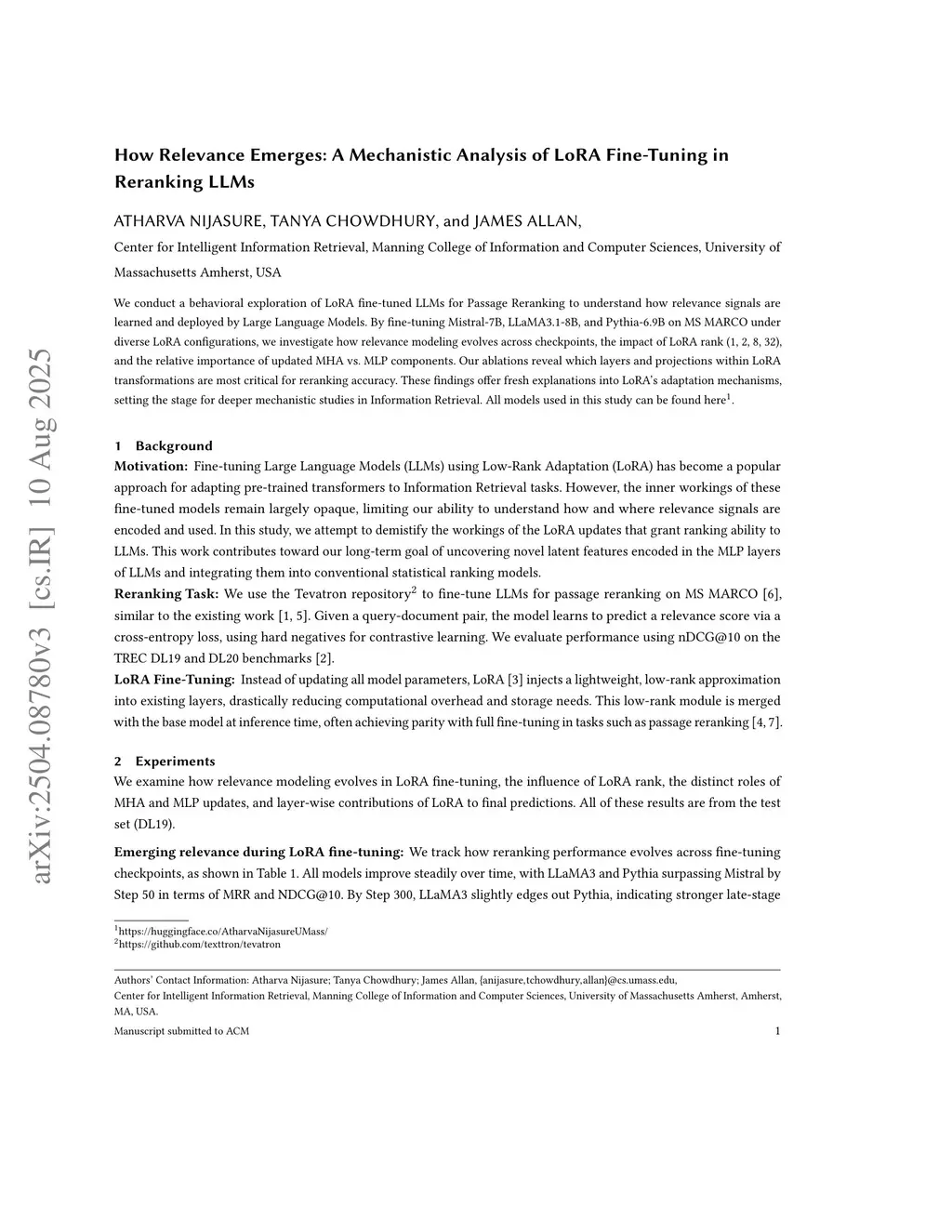 We conduct a behavioral exploration of LoRA fine-tuned LLMs for Passage Reranking to understand how relevance signals are learned and deployed by Large Language Models. By fine-tuning Mistral-7B, LLaMA3.1-8B, and Pythia-6.9B on MS MARCO under diverse LoRA configurations, we investigate how relevance modeling evolves across checkpoints, the impact of LoRA rank (1, 2, 8, 32), and the relative importance of updated MHA vs. MLP components. Our ablations reveal which layers and projections within LoRA transformations are most critical for reranking accuracy. These findings offer fresh explanations into LoRA's adaptation mechanisms, setting the stage for deeper mechanistic studies in Information Retrieval. All models used in this study have been shared.