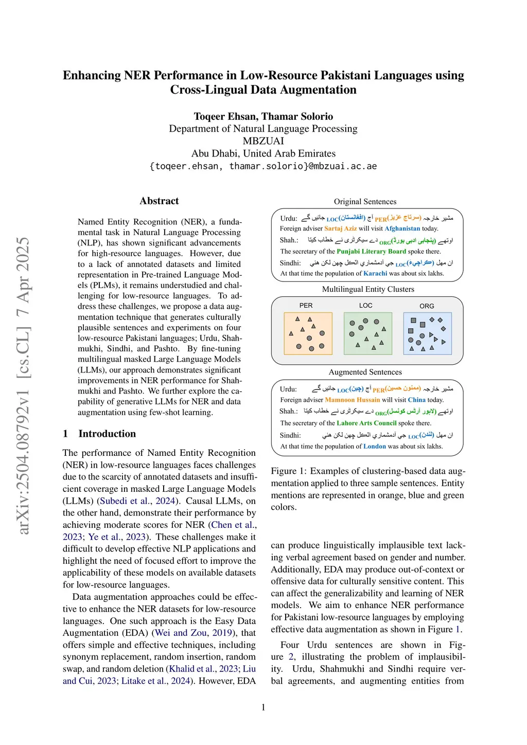 Enhancing NER Performance in Low-Resource Pakistani Languages using Cross-Lingual Data Augmentation