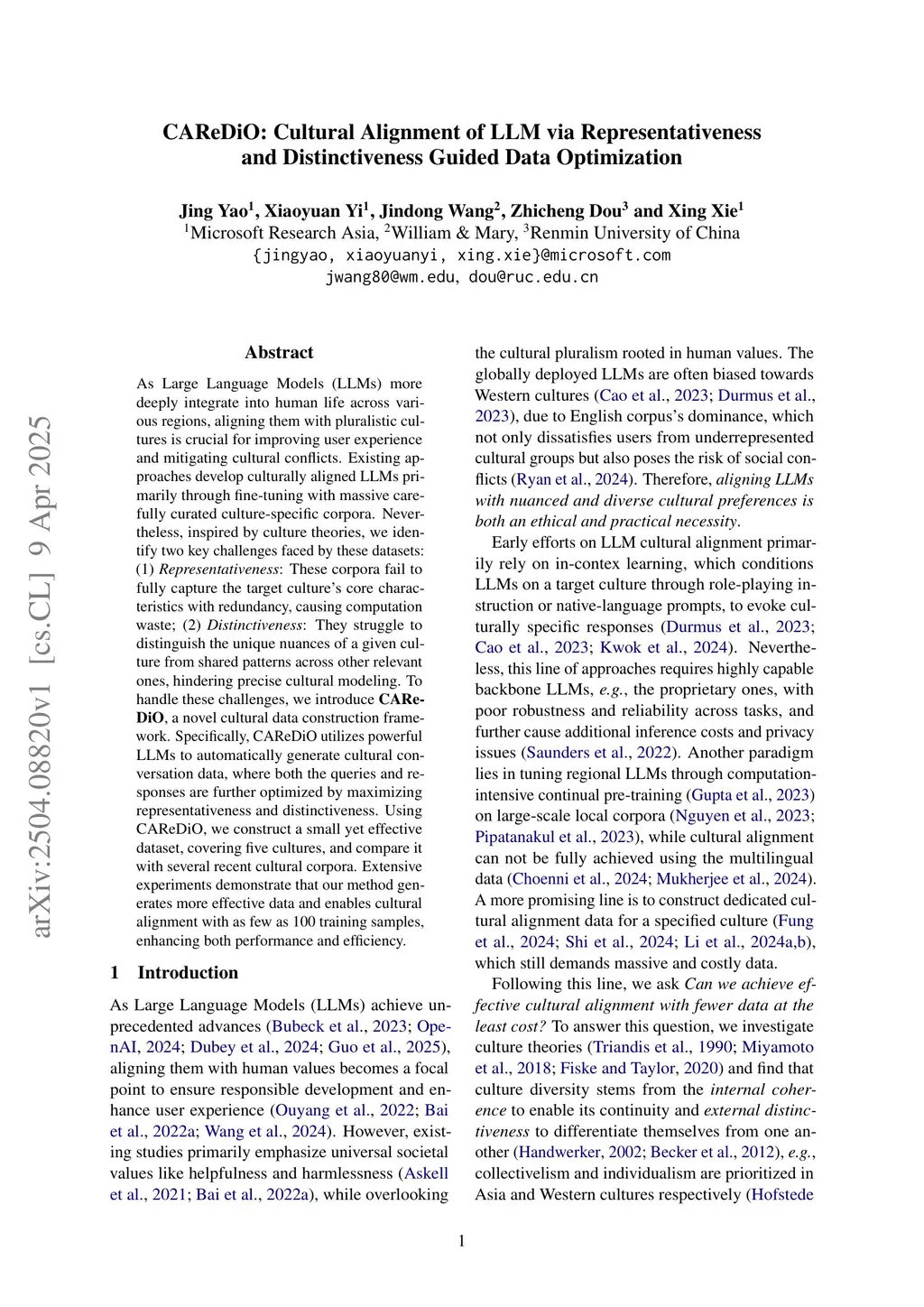 CAReDiO: Cultural Alignment of LLM via Representativeness and Distinctiveness Guided Data Optimization