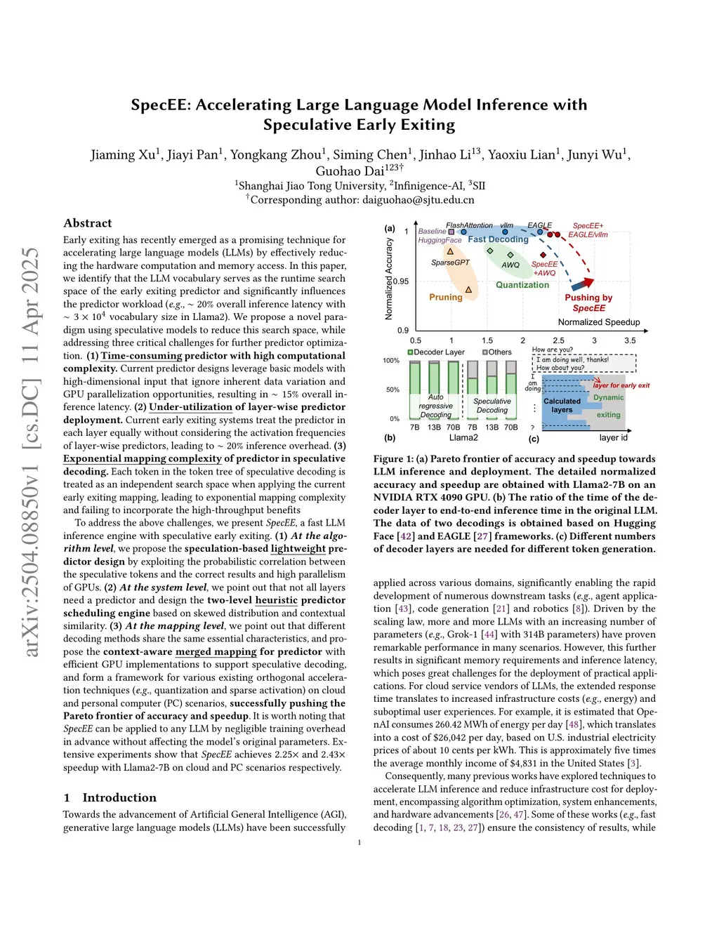 Early exiting has recently emerged as a promising technique for accelerating large language models (LLMs) by effectively reducing the hardware computation and memory access. In this paper, we present SpecEE, a fast LLM inference engine with speculative early exiting. (1) At the algorithm level, we propose the speculation-based lightweight predictor design by exploiting the probabilistic correlation between the speculative tokens and the correct results and high parallelism of GPUs. (2) At the system level, we point out that not all layers need a predictor and design the two-level heuristic predictor scheduling engine based on skewed distribution and contextual similarity. (3) At the mapping level, we point out that different decoding methods share the same essential characteristics, and propose the context-aware merged mapping for predictor with efficient GPU implementations to support speculative decoding, and form a framework for various existing orthogonal acceleration techniques (e.g., quantization and sparse activation) on cloud and personal computer (PC) scenarios, successfully pushing the Pareto frontier of accuracy and speedup. It is worth noting that SpecEE can be applied to any LLM by negligible training overhead in advance without affecting the model original parameters. Extensive experiments show that SpecEE achieves 2.25x and 2.43x speedup with Llama2-7B on cloud and PC scenarios respectively.