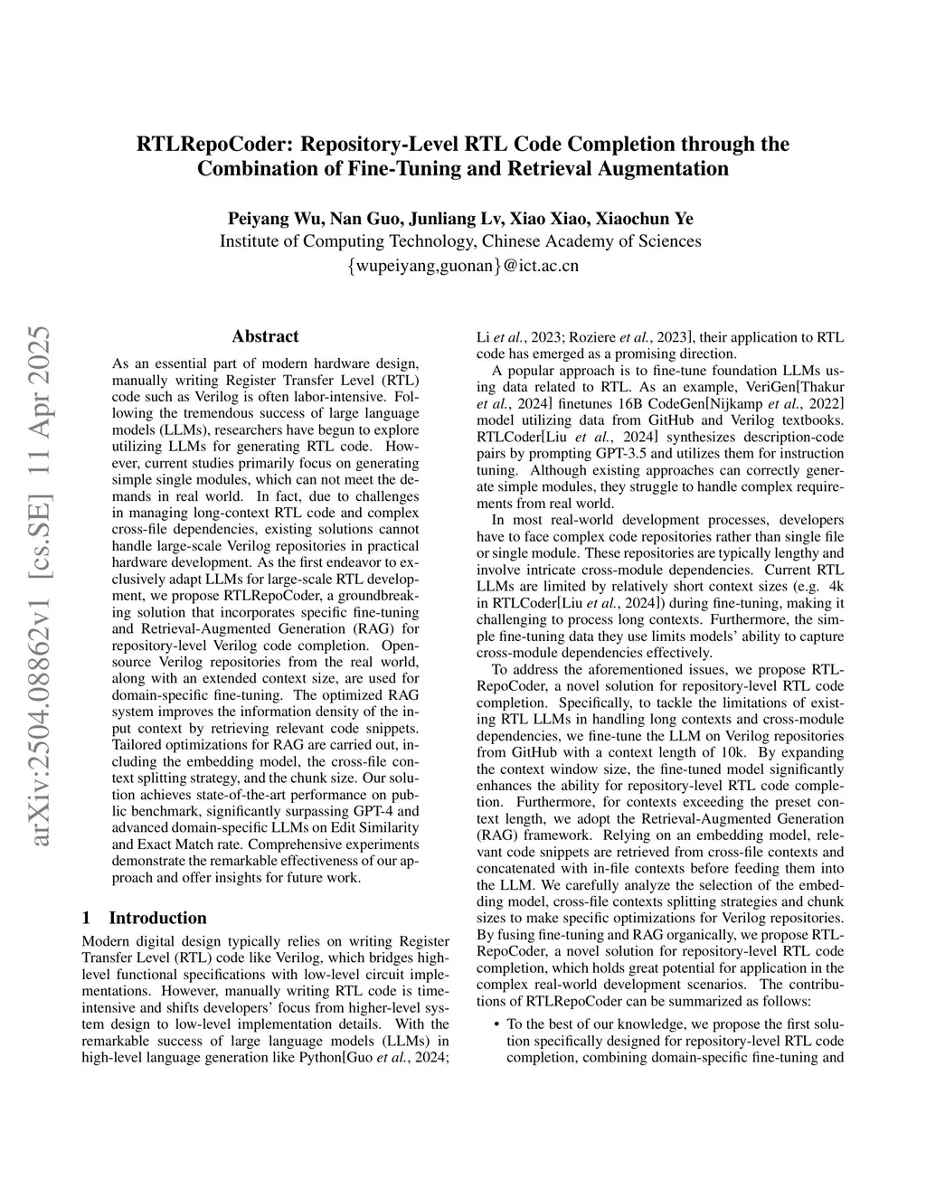 RTLRepoCoder: Repository-Level RTL Code Completion through the Combination of Fine-Tuning and Retrieval Augmentation