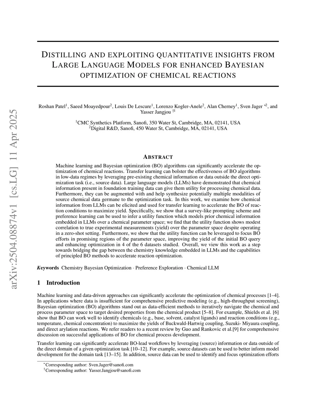 Machine learning and Bayesian optimization (BO) algorithms can significantly accelerate the optimization of chemical reactions. Transfer learning can bolster the effectiveness of BO algorithms in low-data regimes by leveraging pre-existing chemical information or data outside the direct optimization task (i.e., source data). Large language models (LLMs) have demonstrated that chemical information present in foundation training data can give them utility for processing chemical data. Furthermore, they can be augmented with and help synthesize potentially multiple modalities of source chemical data germane to the optimization task. In this work, we examine how chemical information from LLMs can be elicited and used for transfer learning to accelerate the BO of reaction conditions to maximize yield. Specifically, we show that a survey-like prompting scheme and preference learning can be used to infer a utility function which models prior chemical information embedded in LLMs over a chemical parameter space; we find that the utility function shows modest correlation to true experimental measurements (yield) over the parameter space despite operating in a zero-shot setting. Furthermore, we show that the utility function can be leveraged to focus BO efforts in promising regions of the parameter space, improving the yield of the initial BO query and enhancing optimization in 4 of the 6 datasets studied. Overall, we view this work as a step towards bridging the gap between the chemistry knowledge embedded in LLMs and the capabilities of principled BO methods to accelerate reaction optimization.