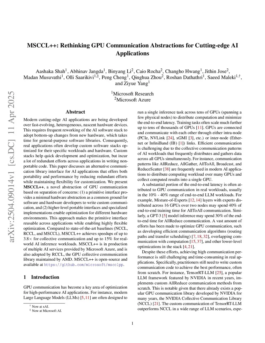 AI applications increasingly run on fast-evolving, heterogeneous hardware to maximize performance, but general-purpose libraries lag in supporting these features. Performance-minded programmers often build custom communication stacks that are fast but error-prone and non-portable.This paper introduces MSCCL++, a design methodology for developing high-performance, portable communication kernels. It provides (1) a low-level, performance-preserving primitive interface that exposes minimal hardware abstractions while hiding the complexities of synchronization and consistency, (2) a higher-level DSL for application developers to implement workload-specific communication algorithms, and (3) a library of efficient algorithms implementing the standard collective API, enabling adoption by users with minimal expertise.Compared to state-of-the-art baselines, MSCCL++ achieves geomean speedups of (up to ) for collective communication and (up to ) for AI inference workloads. MSCCL++ is in production of multiple AI services provided by Microsoft Azure, and has also been adopted by RCCL, the GPU collective communication library maintained by AMD. MSCCL++ is open source and available atthis https URL. Our two years of experience with MSCCL++ suggests that its abstractions are robust, enabling support for new hardware features, such as multimem, within weeks of development.